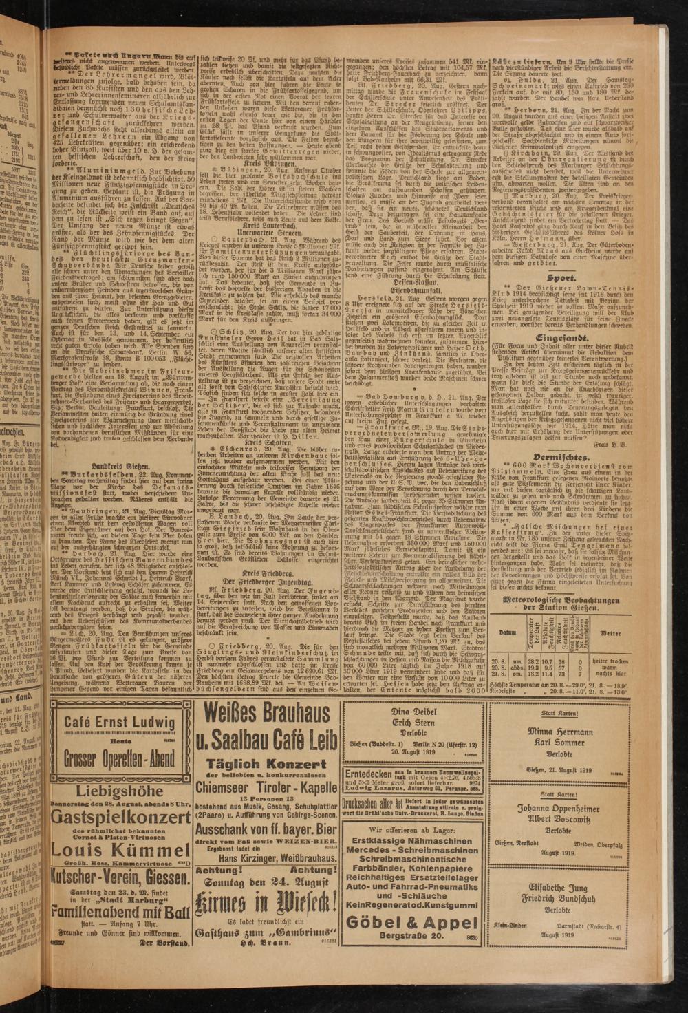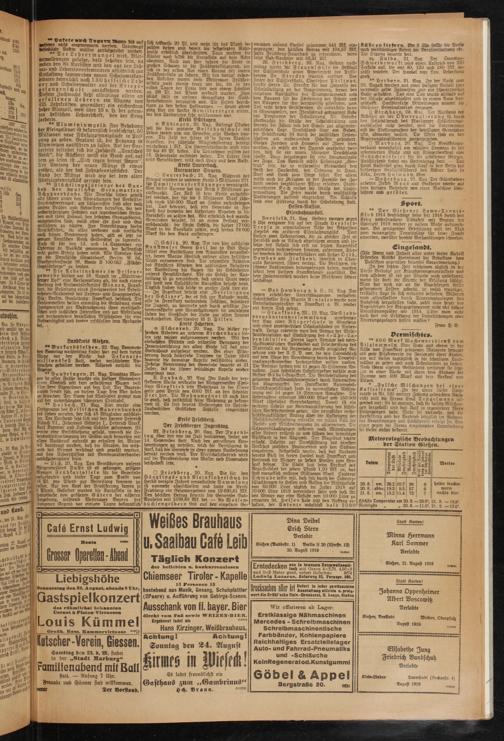 [] Marburg, 20. Aug. Ter Kreiskrieger' verband veranstaltet am rrächsteu Sonntag in der reformierten Kirche und am Kriegerdenkmal eine Gedächtnisfeier für die gefallenen Krieger. Anschließend findet ein Stertretertag statt. — Tas Hotel Kaiserhof ging durch Kauf in den Besitz des bisherigen Geschäftsführers des Kölner Hoss in Köln, Herrn Hofmann, über.