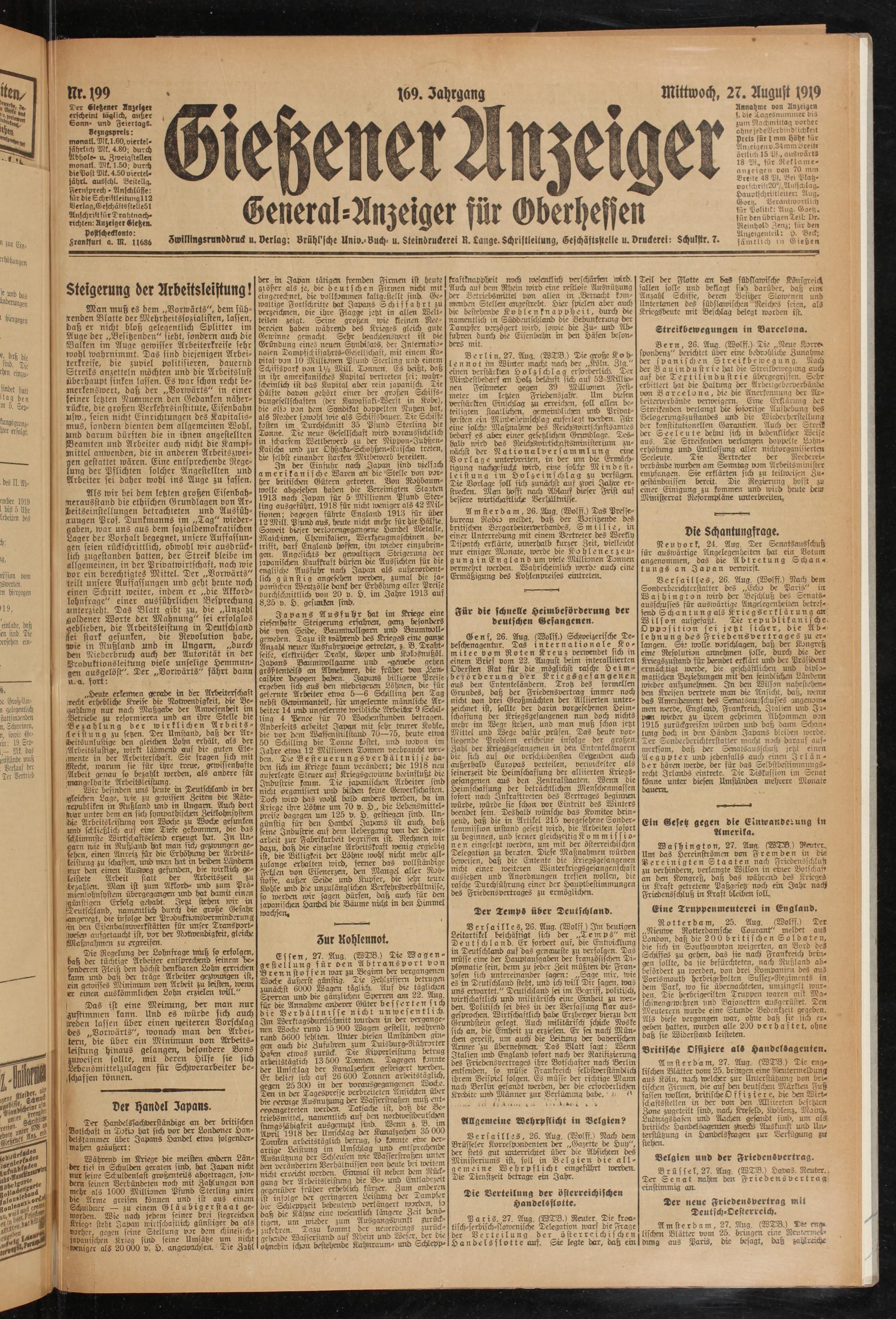 Annahme von Anzeigen s. die Tagesnununer bis zum Nachmittag vorher ohnejedeBerbindlichkeit Preis für 1 mm höhe für Anzeigen v.34mm Üreit« örtlich 15 Pf., auswärts 18 Pf., für Reklanie- anzeige ii von 70 mm Breite 48 Ps. Bei Platz- vorschriil20°/„Auisct)lag. Hauvtfchriitteiter: Aug. Goey. Verantwortlich für Politik: Aug. Goetz, für den übrigen Teil: Dr. Reinhold Zen-; für den Airzeigenteil: p. Beck; sämtlich in Gießen