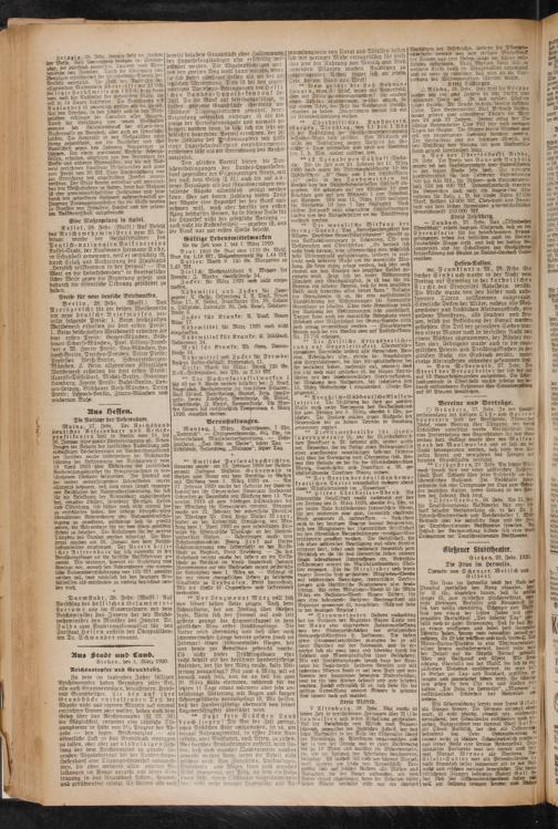 Montag, 1. März. Sdadttheater, 7 Uhr, „Tatterich". — Ortsgewerbeoer^rn, 81/i Uhr, im Gewerbe Haus, Mitgliederversammlung. — Lichtspielhaus, „Das Gift im Weibe", letzter Tag. — Lichtspiele, Seltersweg, „Maseppa", letzter Tag.