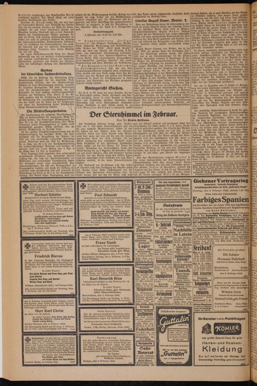 Filmveranstaltung „Farbiges Spanien". Der Gießener Dortragsring (Goethe- Bund, Kulturelle Vereinigung und Volksbildungsstätte Gießen der NSG. „Kraft durch Freude") wird, wie man uns schreibt, am Dienstag, 9. Februar, eine bedeutsame Veranstaltung vermitteln. Es kommt der auf einer Spanien-Expedition der Urania Berlin 1942 aufgenommene ausgezeichnete Farb-Schmalfilm „Farbiges Spanien" mit einem Begleitvortrag von Hans Bötticher zur Aufführung.