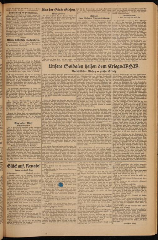 Wenn die Soldaten durch die Stadt marschieren, ist ihnen zu jederzeit klar, erkennbar, wie eng und herzlich verbunden sich die Gießener Bevölkerung mit ihnen weiß. Und wenn die Soldaten, wie am Samstag und am gestrigen Sonntag, die Männer und Frauen, Jungen und Mädchen aufrufen, sich mit ihnen gemeinsam für die Erfüllung einer großen Aufgabe einzufetzen, dann können sie wiederum die Feststellung machen, daß alle Volksgenossen und Vvlksgenossinnen gerne mit ihnen marschieren und wirken. So ist es denn auch nur eine Selbstver^ ständlichkeit, daß der diesjährige Einsatz unserer Soldaten für das Kr iegs-Winterhilfswerk zu einem neuen gewaltigen Erfolg geworden ist, gleichberechtigt und würdig neben feinen' Vorgängern in früheren Jahren.