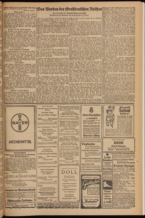 Es ist das tief bewegende Erlebnis der jüngsten Zeit, daß der alte groß deutsche Gedanke zum Lebenssieg gelangt ist und die Einheit der Nation wieder hergestellt wurde, stark wie noch nie. Dieses im alten wurzelnde und doch ganz neue Großdeutsche Reich hat nun auch di e Blutprobe wieder überstanden. Nun bewährten sich alle deutschen Stämme auf den Schlachtfeldern vom hohen Norden bis in den tiefen Westen, und gerade wir Ostmärker sind besonders stolz auf das Heldentum unserer Soldaten bei Narvik. Blut kittet das jahrtausendalte Reich auf unabsehbare Zeit zusammen. Nur eines ist dazu nötig: d i e Liebe zu Volk und Reich, die Hoffnung auf Volk und Reich, der Glaube an Volk und Reich.