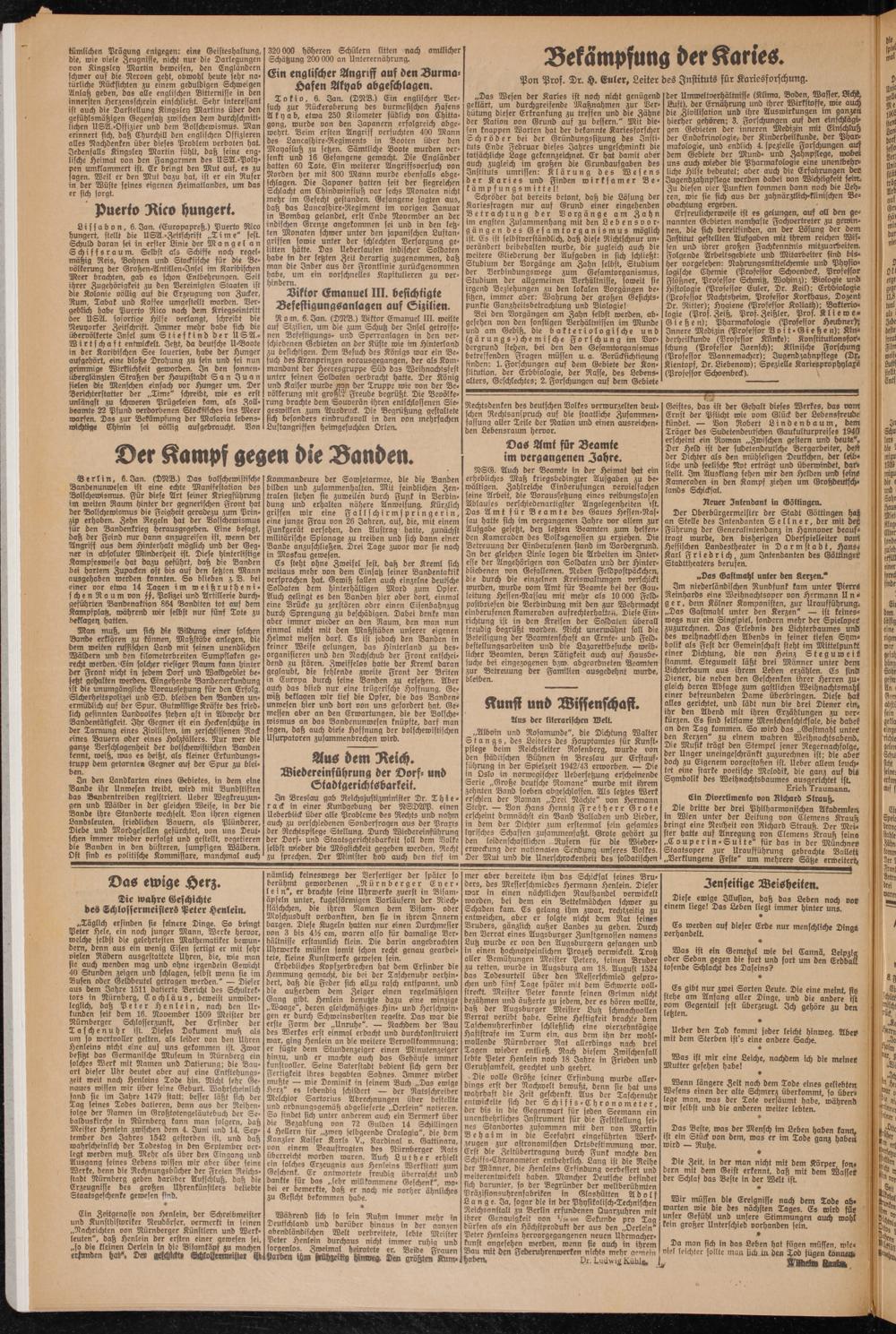 Es steht ohne Zweifel fest, daß der Kreml sich weitaus mehr von dem Einsatz seiner Bandentaktik versprochen hat. Gewiß fallen auch einzelne deutsche Soldaten dem hinterhältigen Mord zum Opfer. Auch gelingt es den Banden hier oder dort, einmal eine Brücke zu zerstören oder einen Eisenbahnzug durch Sprengung zu beschädigen. Dabei denke man aber immer wieder an den Raum, den man nun einmal nicht mit den Maßstäben unserer eigenen Heimat messen darf. Es ist jedoch den Banden in keiner Weise gelungen, das Hinterland zu desorganisieren und den Nachschub der Front entscheidend zu stören. Zweiffelos hatte der Kreml daran geglaubt, die fehlende zweite Front der Briten in Europa durch seine Banden zu ersetzen. Aber auch das blieb nur eine trügerische Hoffnung. Gewiß beklagen wir tief die Opfer, die das Bandenunwesen hier und dort von uns gefordert hat. Gemessen aber an den Erwartungen, die der Bolschewismus an das Bandenunwesen knüpfte, darf man sagen, daß auch diese Hoffnung der bolschewistischen Usurpatoren zusammenbrechen wird.