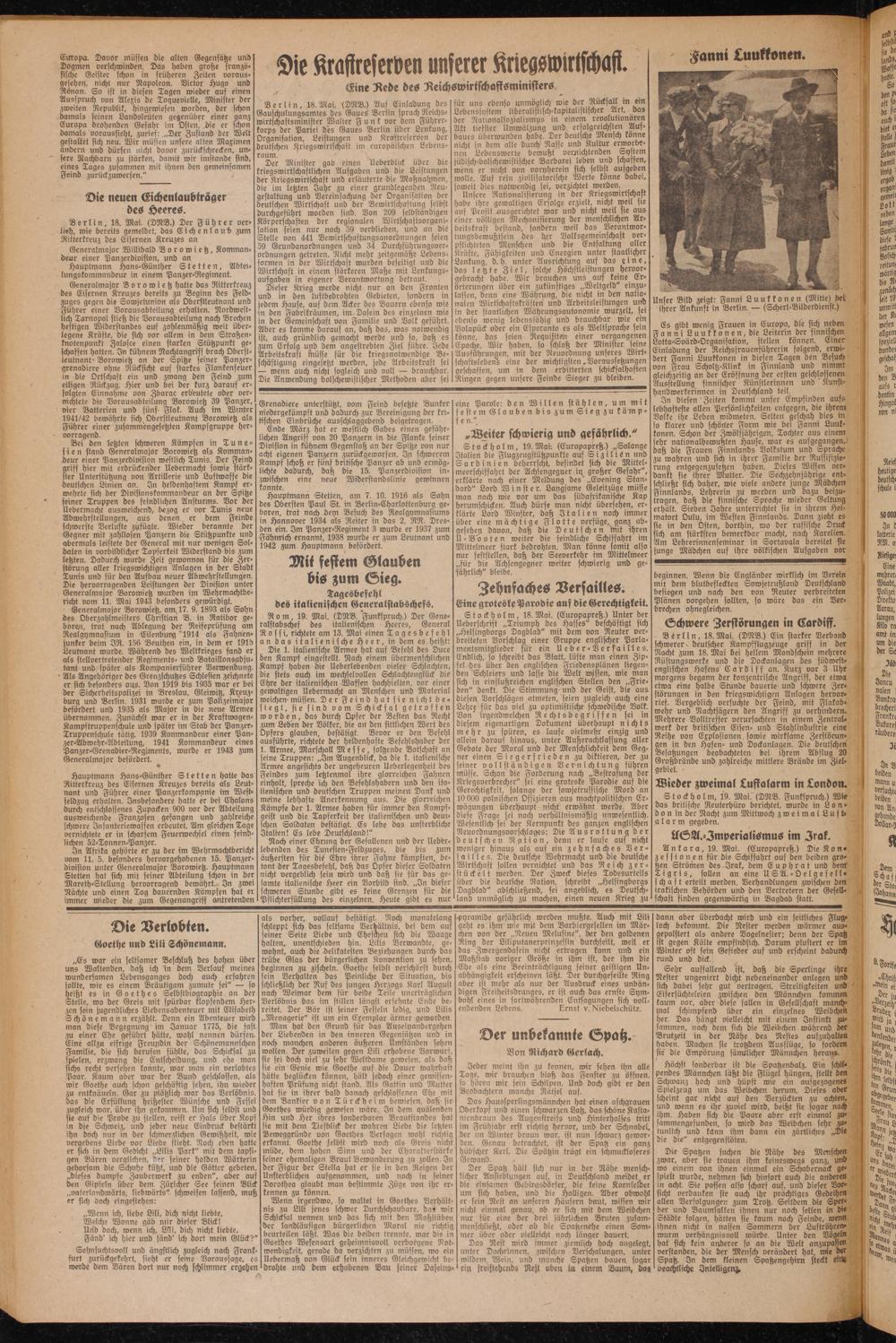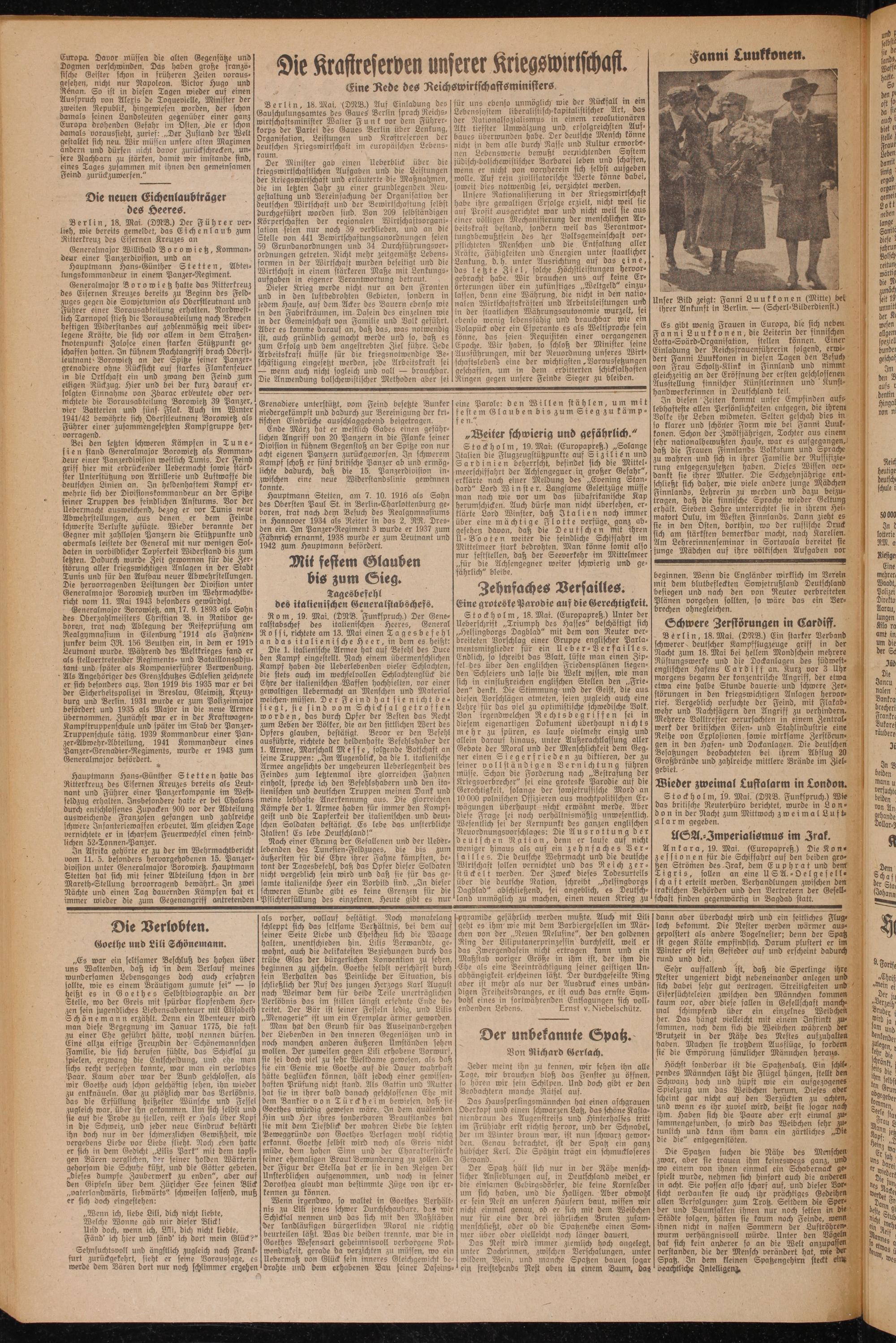 Es gibt wenig Frauen in Europa, die sich neben Fanni Luukkonen, die Leiterin der finnischen Lotta-Svärd-Organisation, stellen können. Einer Einladung der Reichsfrauenführerin folgend, erwidert Fanni Luukkonen in diesen Tagen den Besuch von Frau Scholtz-Klink in Finnland und nimmt gleichzeitig an der Eröffnung der ersten geschlossenen. Ausstellung finnischer Künstlerinnen und Kunst- handwerkerinnen in Deutschland teil.