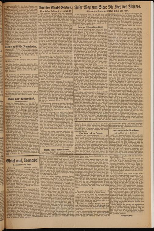In der überfüllten Aula, in der sich viele nur mit einem Stehplatz begnügen mußten, sand am Samstagabend eine große Kundgebung der Gießener Bevölkerung statt, zu der die Partei aufgerufen hatte. Nach der Eröffnung durch den Kreisleiter Oberbereichsleiter B a ck h a u s und dem gemeinsam gesungenen ersten Vers des Liedes „Volk ans Gewehr" sprach der Reichsredner