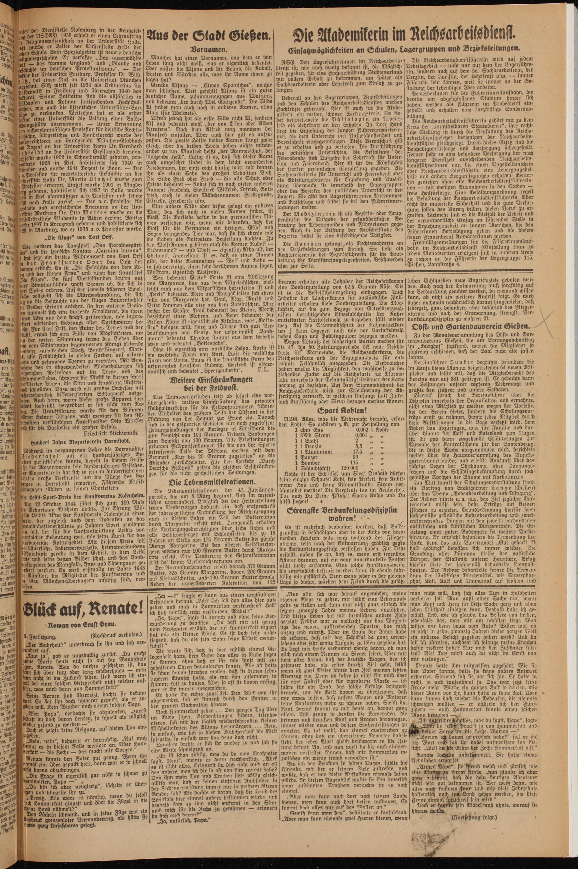 Freiwilligenmeldungen für die Führerinnenlauf- bahn im Reichsarbeitsdienst (Einstellung kann zu jedem Monatsersten erfolgen) sind in unserem Kreis zu richten an die Führerin der Lagergruppe 115, Gießen, Lonystraße 4.