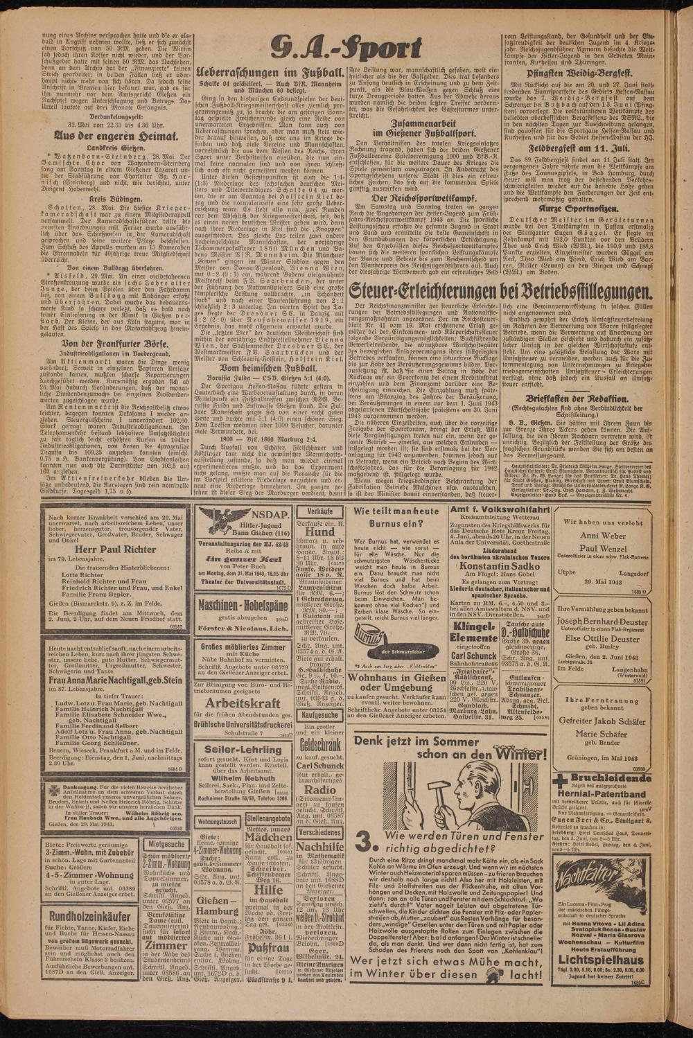 Den Verhältnissen des totalen Kriegseinsatzes Rechnung tragend, haben sich die beiden Gießener Fußballvereine Spielvereinigung 1900 und VfB.-R. entschlossen, für die weitere Dauer des Krieges die Spiele gemeinsam auszutragen. In Anbetracht des Sportgeschehens unserer Stadt ist dies ein erfreuliches Zeichen, das sich auf die kommenden Spiele günstig auswirken wird.