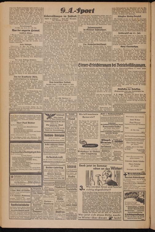 Der Sportgau Hessen-Nassau führte gestern in Lauterbach eine Werbeveranstaltung durch, in deren Mittelpunkt ein Fußballtreffen zwischen RSG. Borussia Fulda und Luftwaffe Gießen stand. Die Fuldaer Mannschaft zeigte sich von einer recht guten Seite und buchte mit 5:1 (4:0) einen schönen Sieg. Dem Treffen wohnten über 1000 Besucher, darunter viele Verwundete, bei.