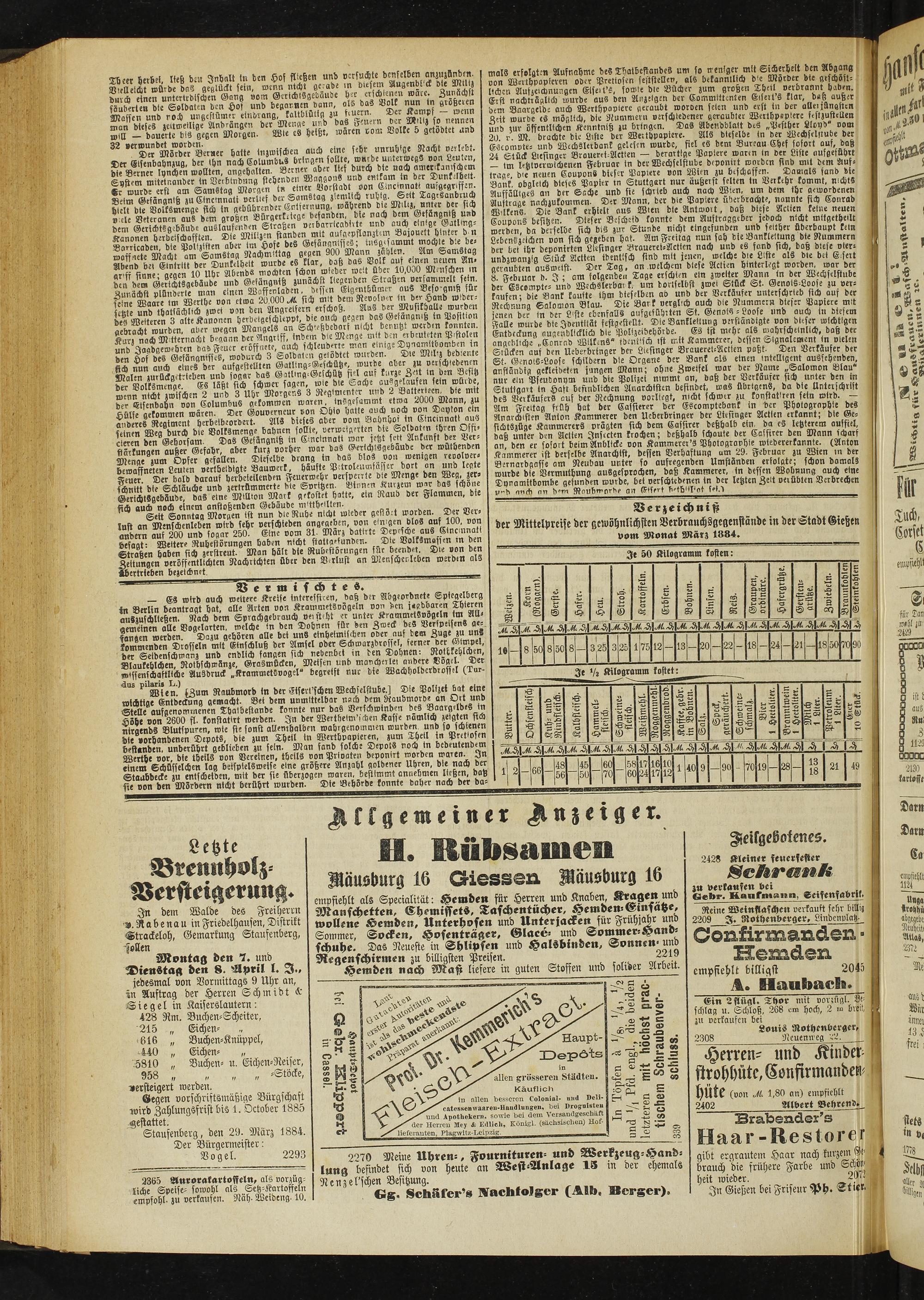 Verzeichnis der Mittelpreise der fiewöhnlichsten Verbrauchsgegenstände in der Stadt Gietzen vom Monot März 1884.