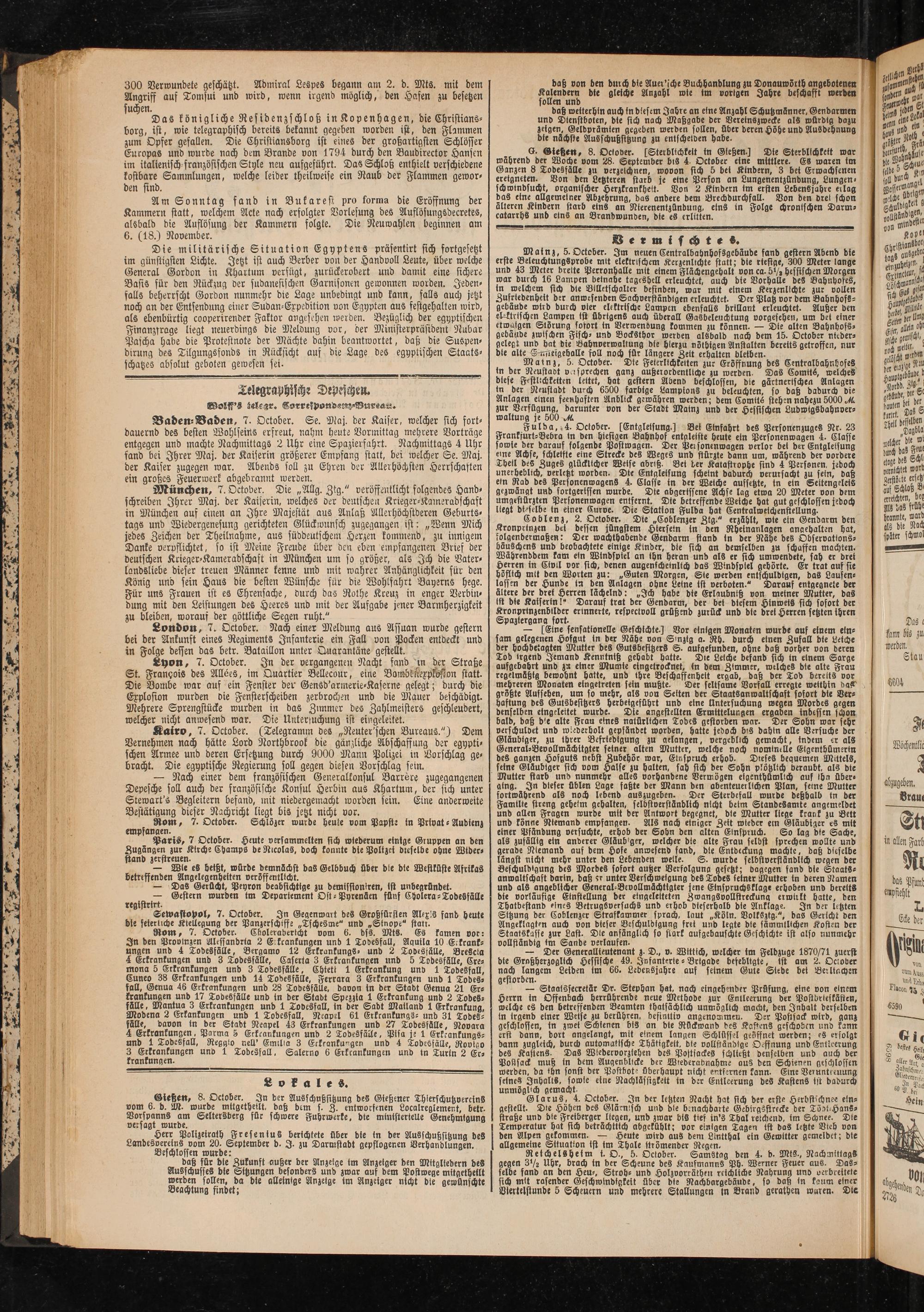 Mainz, 5- October. Die Feierlichkeiten zur Eröffnung des Centralbahnhofes in der Neustadt mr sprechen ganz außerordentliche zu werden- Das Comitö, welches diese Festlichkeiten leitet, hat gestern Abend beschlossen, die gärtnerischen Anlagen in der Neustadt durch 6500 farbige Lampions zu beleuchten, so daß dadurch die Anlagen einen feenhaften Anblick gewähren werden; dem Comttä stehm nahezu 5000 zur Verfügung, darunter von der Stadt Mainz und der Hessischen Ludwtgsbahnoer- waltung je 500 JL