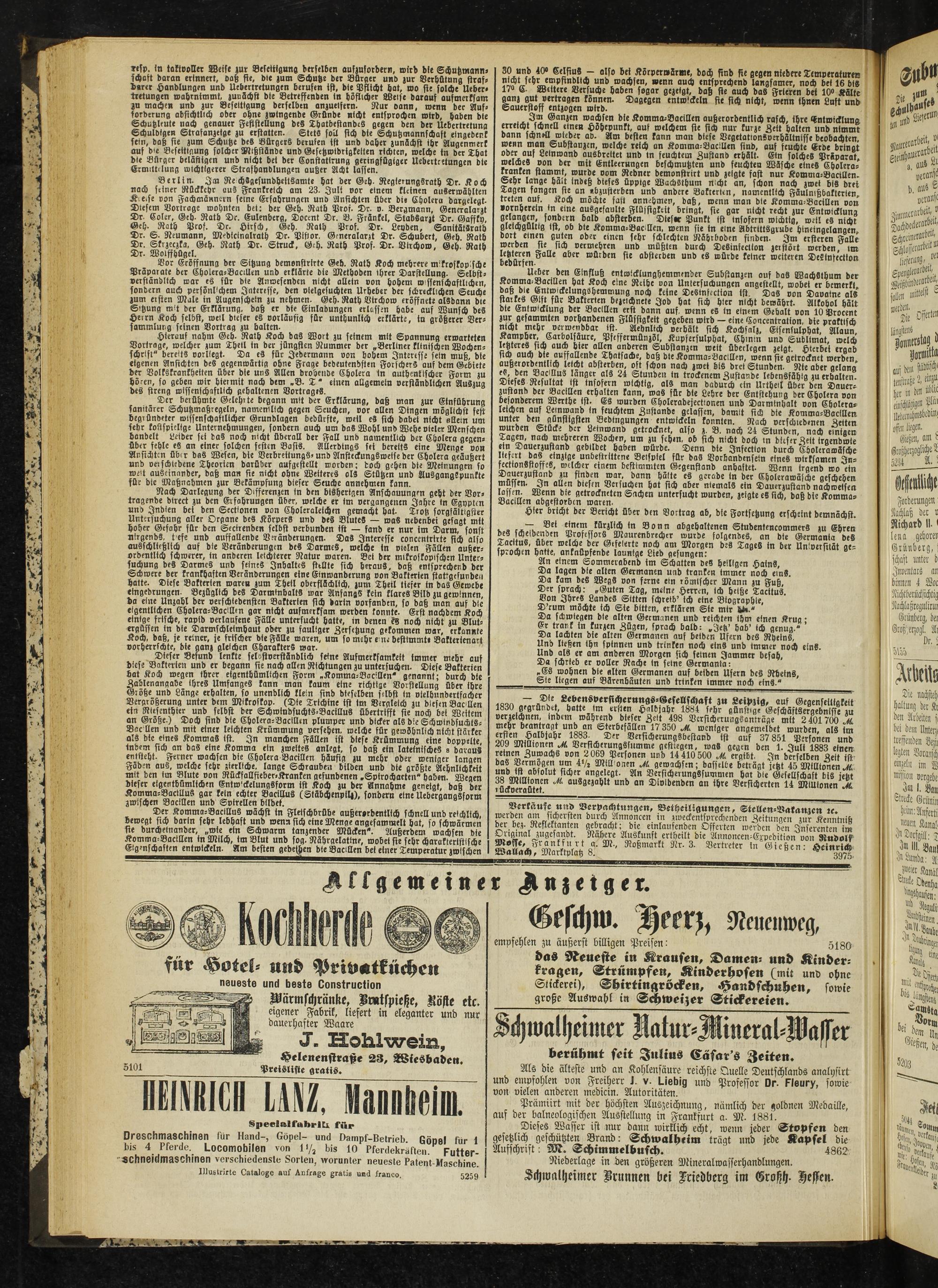 Hierauf nahm Geh. Rath KoL das Wort zu seinem mit Spannung erwarteten Vorträge, welcher zum Thetl in der jüngsten Nummer der „Berliner klinischen Wochenschrift" bereits oorliegt. Da es für Jedermann von hohem Interesse sein muß, die eigenen Ansichten des gegenwärtig ohne Frage bedeutendsten Forschers auf dem Gebiete der Volkskrankheiten über die uns Allen drohende Cholera in authentischer Form zu hören, so geben wir hiermit nach dem „B. T * einen allgemein verständlichen Auszug des streng wissenschaftlich gehaltenen Vortrages.