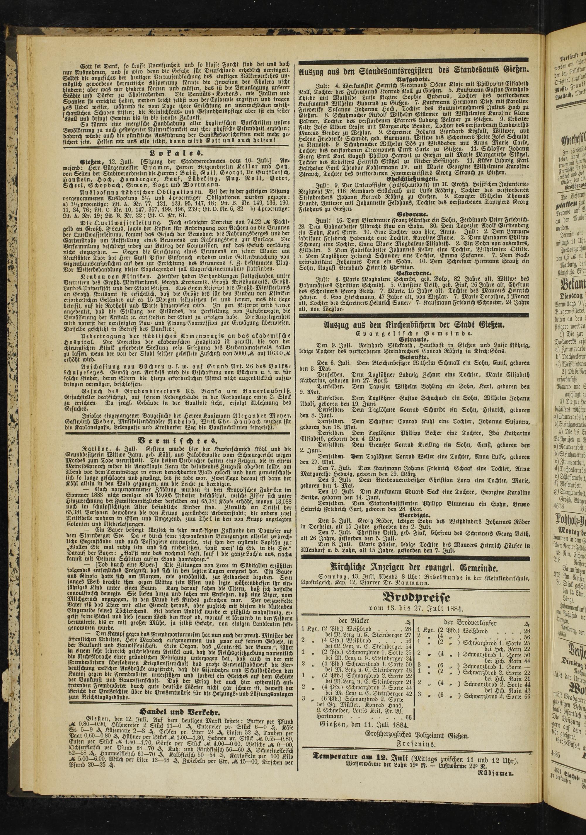 Jult: 4. Werkmeister Heinrich Feroinund Oscar Klose mit Philtpp'ne Elisabeth Noll, Tochter des Fuhrmanns Konrad Noll ,u Gießen- 5. Kausmann Guftav Reinhold Thiede mit Mathilde Luise Regine Sophie Buderus, Tochter des verstorbenen Kaufmanns Wilhelm Buderus zu Gießen. 7. Kaufmann Hermann Dietzl mit Karoline Friederike Susanne Johanna Hock, Tochter des Bauunternehmers Julius Hoch zu Gießen. 8. Schuhmacher Rudolf Wilhelm Stürmer mit Wilhelmine Karol ne Clara Palmer, Tochter des verstorbenen Pfarrers Ludwig Palmer zu Gießen. 9. Arbeiter Felix Josef Albert Lenser mit Margarethe Bender, Tochter des verstorbenen Landwtrths Marcus Bender zu Wetzlar. 9. Schreiner Johann Leonhard Ktßkalt, Wittwer, mit Helene Friederike Schmidt, geb. Burmann, Wtttwe des Schreiners Peter Josef Sckmidt zu Neuwied. 9 Schuhmacher Wilhelm Bös zu Wiesbaden mit Anna Marte Carle, Tochter des oeiftorbenen Ökonomen Ernst Carle zu Gießen. 11. Schlosser Johann Georg Ernt! Karl August Philipp Hampel zu Gießen mit Marie Margarethe Stützet, Tockter des Arbeiters Heinrich Stütze! zu Nteder-Bessingen. 11. Küfer Ludwig Karl Balthasar Emil Theodor Kohlermann IV. mit Marie Georgine Wilhelmine Karoline Strauch, Tochter des verstorbenen Zimmermeifters Georg Strauch zu Gießen.