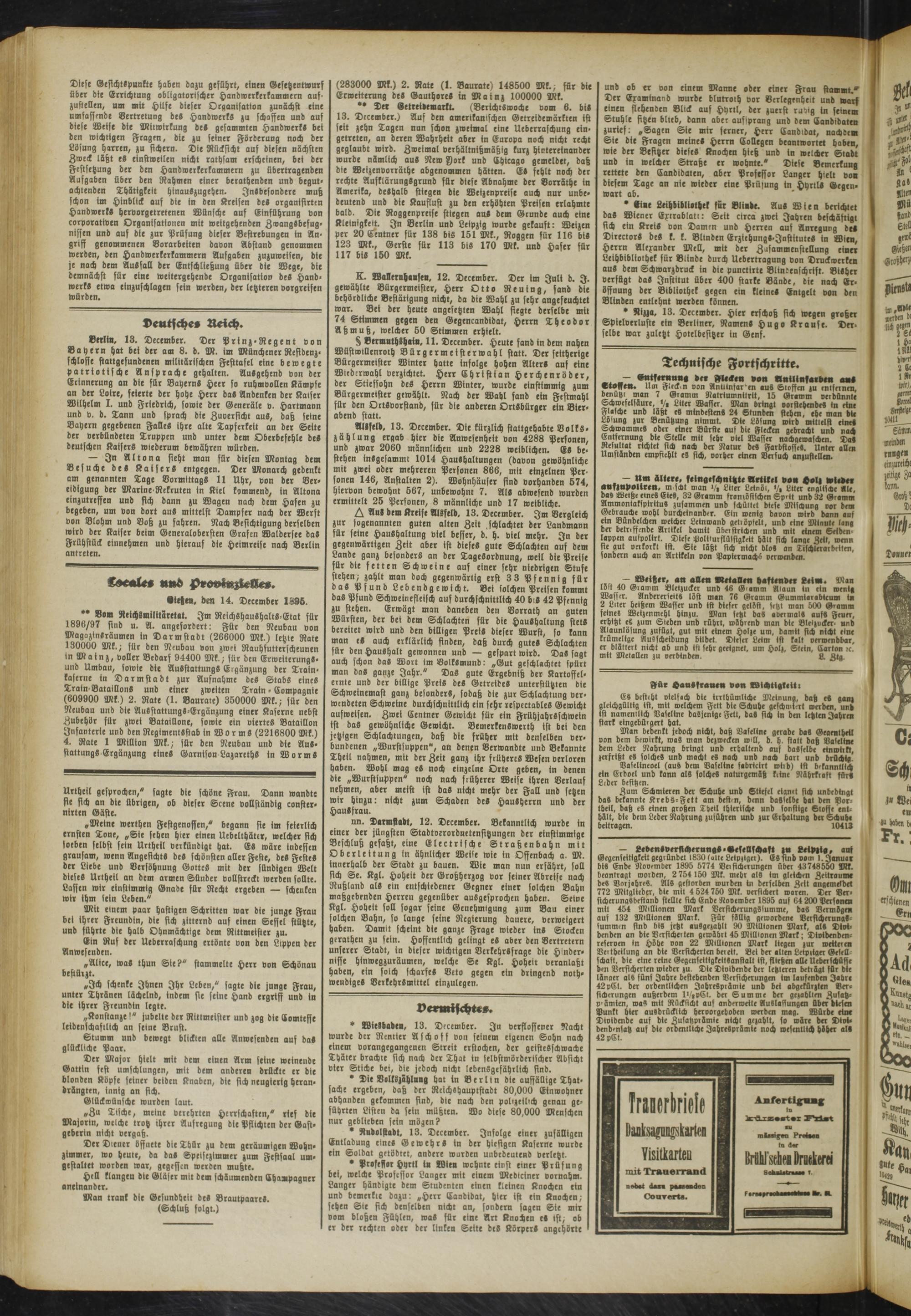 Berlin, 13. December. Der Prinz-Regent von Bayern hat bei der am 8. d. M. im Münchener Residenz, schlöffe stattgefundenen milttärischen Festtafel eine bewegte patriotische Ansprache gehalten. Ausgehend von der Erinnerung an die für Bayerns Heer so ruhmvollen Kämpfe an der Loire, feierte der hohe Herr das Andenken der Kaiser Wilhelm I. und Friedrich, sowie der Generäle v. Hartmann und v. d. Tann und sprach die Zuversicht auS, daß seine Bayern gegebenen Falles ihre alte Tapferkeit an der Seite der verbündeten Truppen und unter dem Oberbefehle de» deutschen Kaisers wiederum bewähren würden.