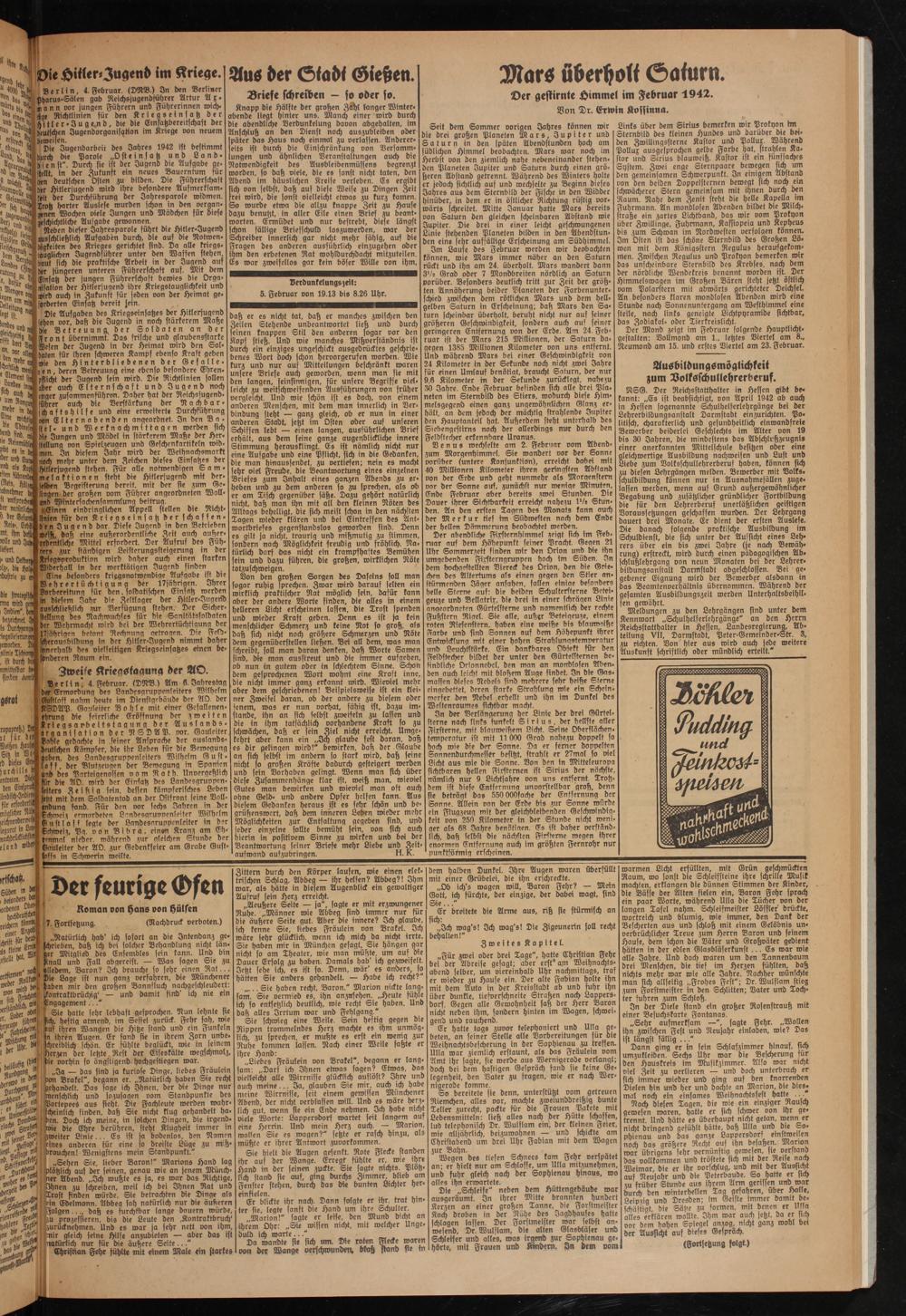 NSG. Der Reichsstatthalter in Hessen gibt bekannt: „Es ist beabsichtigt, von April 1942 ab auch in Hessen sogenannte Shulhelferlehrgänge bei der Lehrerbildungsanstalt Darmstadt einzurichten. Politisch, charakterlich und gesundheitlich einwandfreie Bewerber beiderlei Geschlechts im Alter von 19 bis 30 Jahren, die mindestens das Abschlußzeugnis einer anerkannten Mittelschule besitzen oder eine aleichwertige Ausbildung nachweisen und Lust unb Liebe zum Volksschullehrerberuf haben, können sich au diesen Lehrgängen melden. Bewerber mit Volks. Schulbildung können nur in Ausnahmefällen zuge- lassen werden, wenn auf Grund außergewöhnlicher Begabung und zusätzlicher gründlicher Fortbildung die für den Lehrerberuf unerläßlichen geistigen Voraussetzungen geschaffen wurden. Der Lehrgang dauert drei Monate. Er dient der ersten Auslese. Die danach folgende praktische Ausbildung im Schuldienst, die sich unter der Aussicht eines Lehrers über ein bis zwei Jahre (je nach Bewährung) erstreckt, wird durch einen pädagogischen Abschlußlehrgang von neun Monaten bei der Lehrer- bibdungsanstalt Darmstadt abgeschlossen. Bei gegebener Eignung wird der Bewerber alsdann in das Beamtenverhältnis übernommen. Während der gesamten Ausbildungszeit werden Unterhaltsbeihil- fen gewährt.