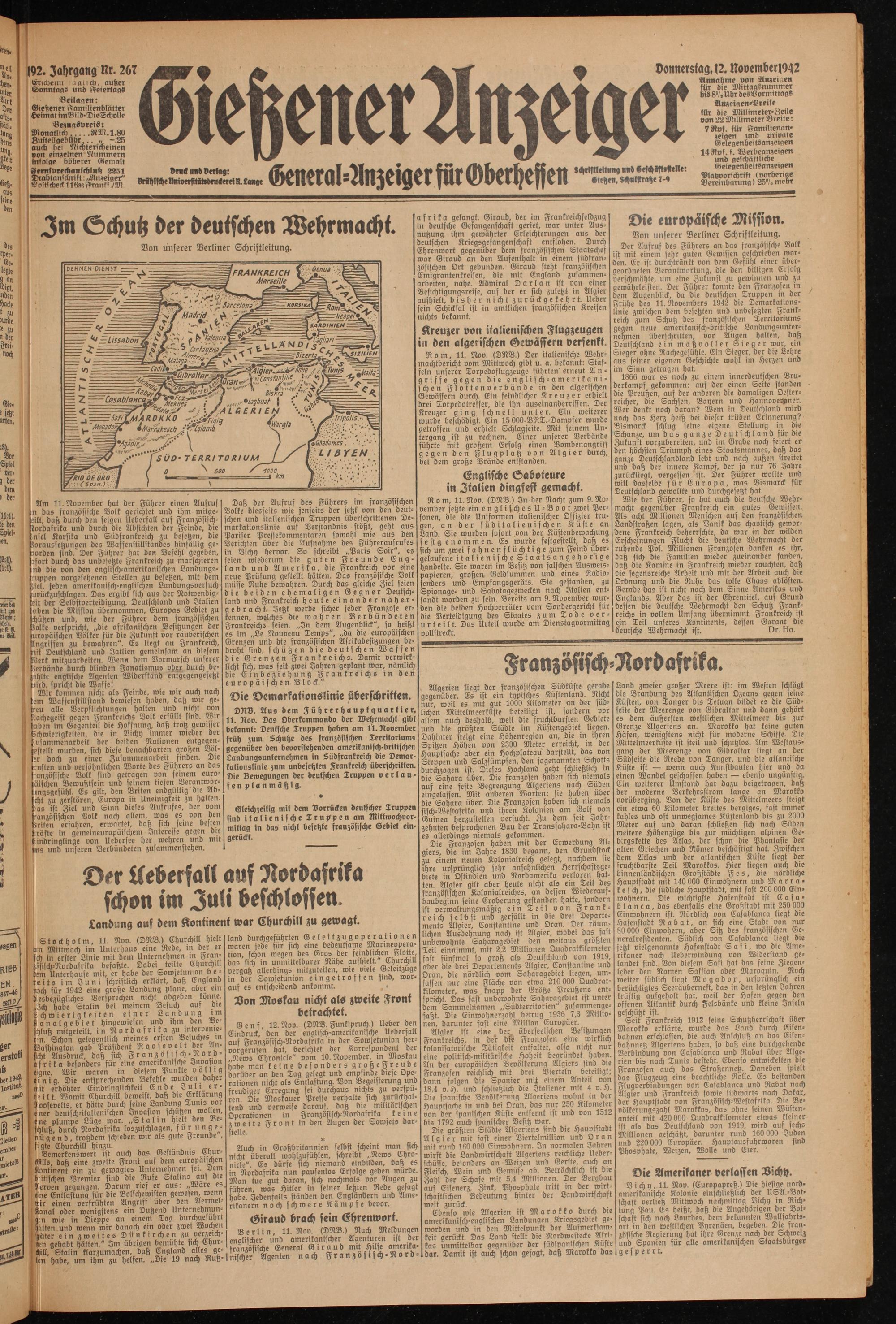 DNV. Aus dem Führerhauptquarlier, 11. Nov. Das Oberkcmmando der Wehrmacht gibt bekannt: Deutsche Truppen haben am 11. November früh zum Schuhe des französischen Territoriums gegenüber den bevorstehenden amerikanisch-britischen Landungsunternehmen in Südfrankreich die Demarkationslinie zum unbesetzten Frankreich überschritten. Die Bewegungen der deutschen Truppen v e r laufe n p t a n m ä h i g.