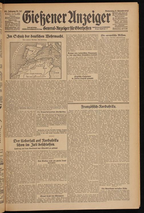 schen Flottenverbände in den algerischen Gewässern durch. Ein feindl eher Kreuzer erhielt drei Torpedotreffer, die ihn auseinanderrissen. Der Kreuzer ging schnell unter. Ein weiterer wurde beschädigt. Ein 15 000-BRT.-Dampfer wurde getroffen und erhielt Schlagseite. Mit seinem Untergang ist zu rechnen. Einer unserer Verbände führte mit großem Erfolg einen Bombenangriff gegen den Flugplatz von Algier durch, bei dem große Brände entstanden.