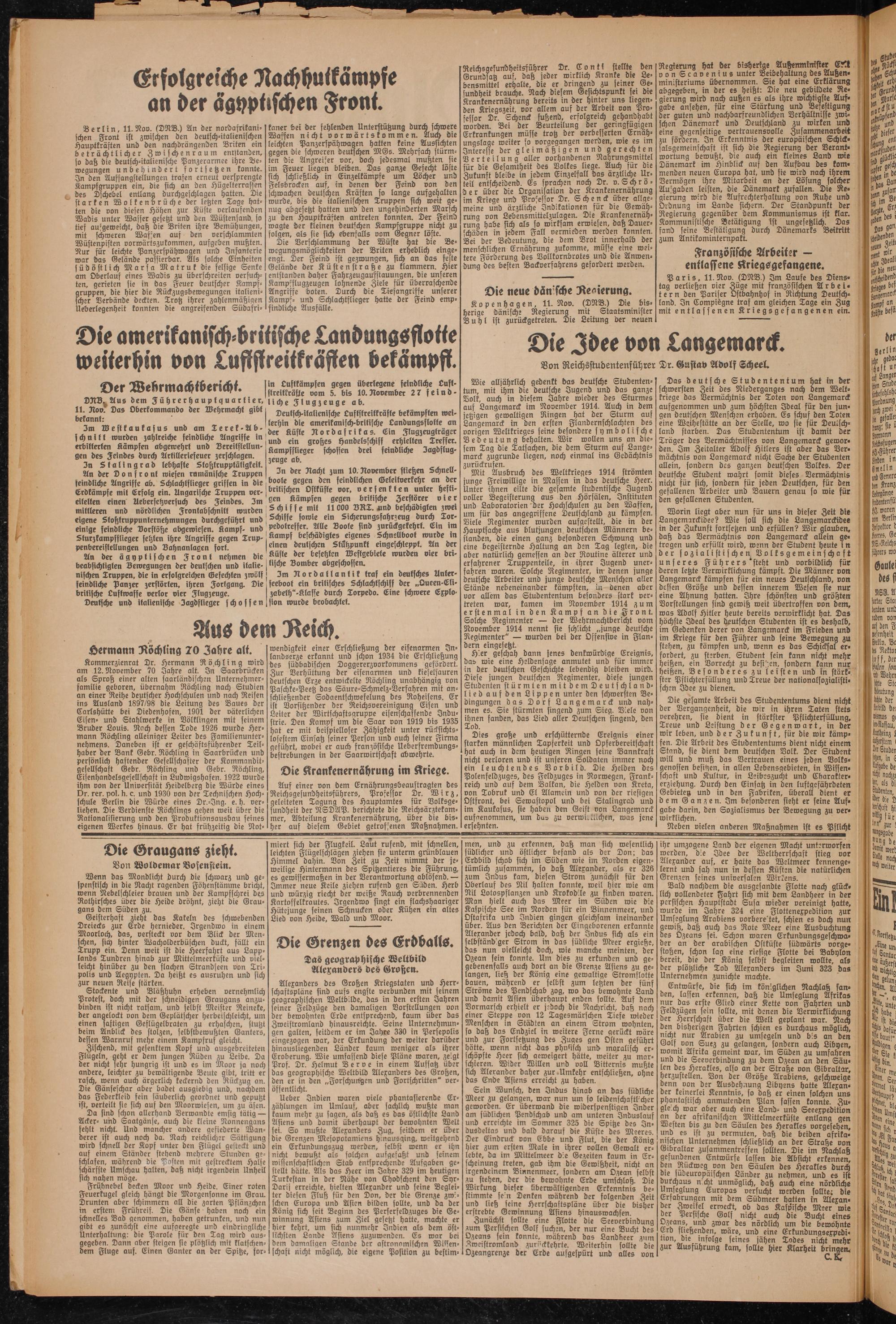 | Deutsch-italienische Luftstreitkräfte bekämpften wei- s terhin die amerikanisch-britische Landungsflotte an der Küste Rordafrikas. Lin Flugzeugträger und ein großes Handelsschiff erhielten Treffer. Kampfflieger schossen drei feindliche 3agdflug- zeuge ab.
