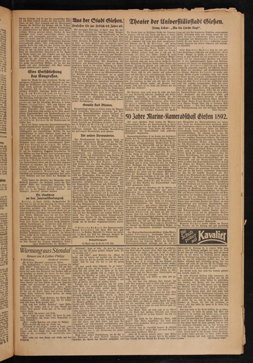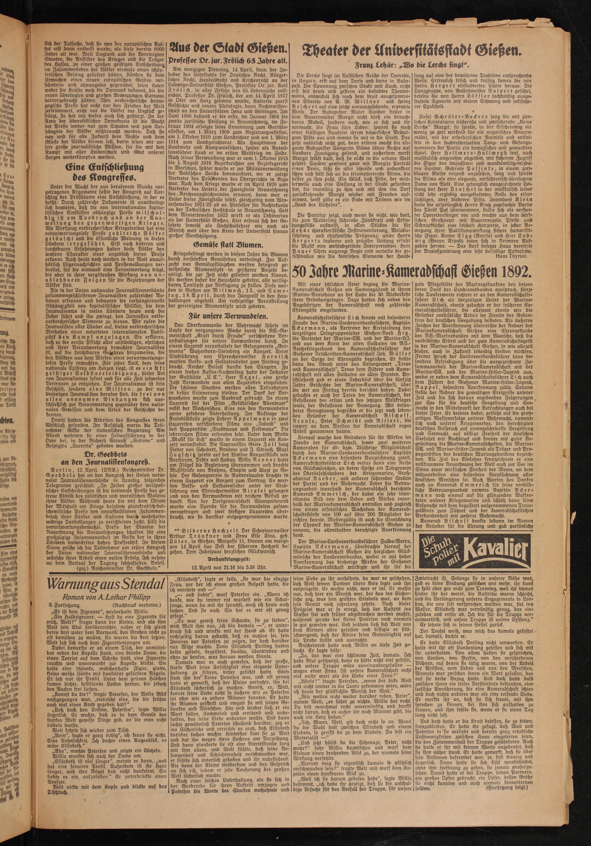 Am morgigen Dienstag, 14. April, kann der Inhaber des Lehrstuhls für Deutsches Recht, Bürgerliches Recht, Handelsrecht und Kirchenrecht an der Ludwigs-Universität Gießen, Professor Dr. jur. Karl Frölich, in aller Frische sein 65. Lebensjahr vollenden. Professor Dr. Frölich, der am 14. April 1877 in Oker am Harz geboren wurde, studierte zuerst Geschichte und neuere Philologie, dann Rechtswissenschaft an den Universitäten Jena und Göttingen. Im Juni 1900 bestand er die erste, im Januar 1904 die zweite juristische Prüfung in Braunschweig, im Februar 1904 erfolgte feine Ernennung zum Gerichtsassessor, am 1. März 1909 zum Regierungsassessor, am 1. Oktober 1910 zum Landrichter und am 1. März 1914 zum Landgerichtsrat. Als Hauptmann der Landwehr und Kompanieführer, später als Bataillonsführer stand er im ersten Weltkrieg im Felde. Nach seiner Verwundung war er vom 1. Oktober 1915 bis 1. August 1916 Bezirksrichter am Bezirksgericht in Warschau, später wurde er zur Militärverwaltung der Baltischen Lande kommandiert, wo er zuletzt Vertreter des Präsidenten des Obergerichts in Riga war. Nach dem Kriege wurde er im April 1920 zum Vertreter des Leiters der Zweigstelle Braunschweig des Reichsausgleichsamtes ernannt, dann war er Leiter dieser Zweigstelle selbst, gleichzeitig vom Wintersemester 1921/22 ab ao. Professor für Rechtskunde an der Technischen Hochschule in Braunschweig. Seit dem Wintersemester 1923 wirkt er als Ordinarius an der Univepsität Gießen. Hier erfreut sich der Gelehrte sowohl als Hochschullehrer wie auch als Mensch weit über den Kreis der Universität hinaus großer Wertschätzung.