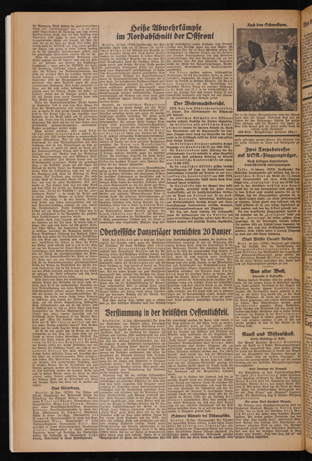 An einer Stelle des mittleren Frontabschnitts gelang es den Bolschewisten, unter Ausnutzung des für sie günsttgen Geländes, mit überlegenen Kräften die deutschen Sicherungen zu durchstoßen und in die deutschen Linien ein,zudringen. Ungeachtet der strengen Kälte traten die deutschen Soldaten sofort zu einem Gegenangriff an, der den Feind zum Ausweichen zwang unter hohen Verlusten an Menschen und Material. Die vom Feind mitgeführten schweren Waffen und zahlreiche Skiausrüstunqen fielen in deutsche Hand. Bei mehreren Unternehmungen gegen vom Feind besetzte Orffchaften erlitten die Bol- schewisten besonders hohe blutige Verluste. In verschiedenen Orten kam es dabei zu harten Nahkampfen, in denen die deutschen Infanteristen den Bolschewisten schwere Verluste zufügten. Im Raum ostwärts von Kursk, 150 Kilometer südlich Drei, versuchten die Bolschewisten von einer in Besitz genommenen Ortschaft aus, die Front zu durchbrechen oder elnzudrücken. Mehrere Tage hin