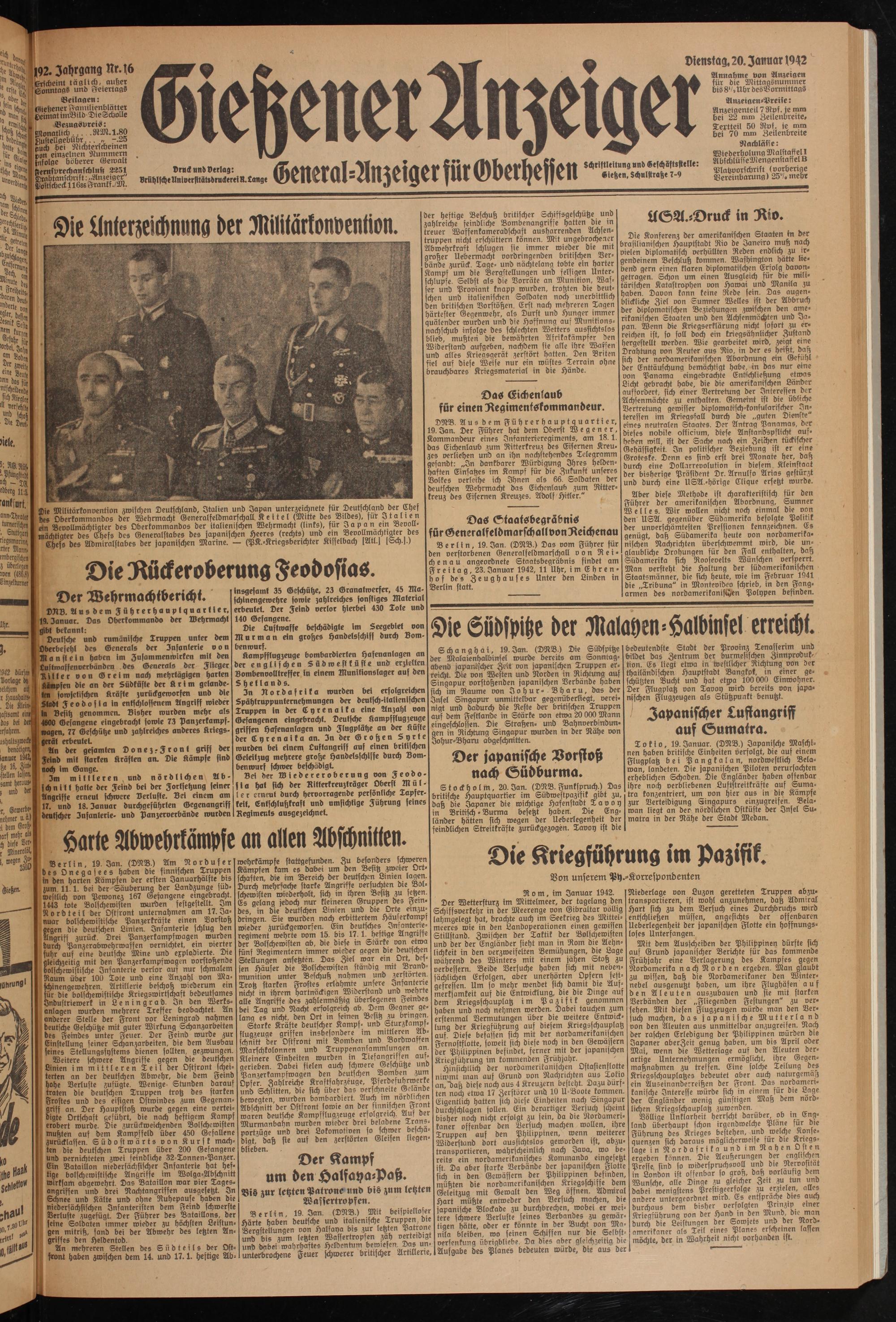 wchrkampfe stattgefunden. Zu besonders schweren Kämpfen kam es dab-ei um den Besitz zweier Ort-1 schäften, die im Bereich der deutschen Linien lagen. I Durch mehrfache starke Angriffe versuchten die Bolschewisten wiederholt, sich in ihren Besitz zu setzen. I Es gelang jedoch nur kleineren Gruppen des Feindes, in die deutschen Linien und die Orte einzudringen. Sie wurden nach erbittertem Häuserkampf wieder zurückgeworfen. Ein deutsches Infanterieregiment wehrte vom 15. bis 17.1. heftige Angriffe der Bolschewisten ab, die diese in Stärke von etwa fünf Regimentern immer wieder gegen die deutschen Stellungen ansetzten. Das Ziel war ein Ort, dessen Häuser die Bolschewisten ständig mit Brandmunition unter Beschütz nahmen und zerstörten. Trotz starken Frostes erlahmte unsere Infanterie nicht in ihrem hartnäckigen Widerstand und wehrte alle Angriffe des zahlenmäßig überlegenen Feindes bei Tag und Nacht erfolgreich ab. Dem Gegner gelang es nicht, den Ort in fernen Besitz zu bringen.!