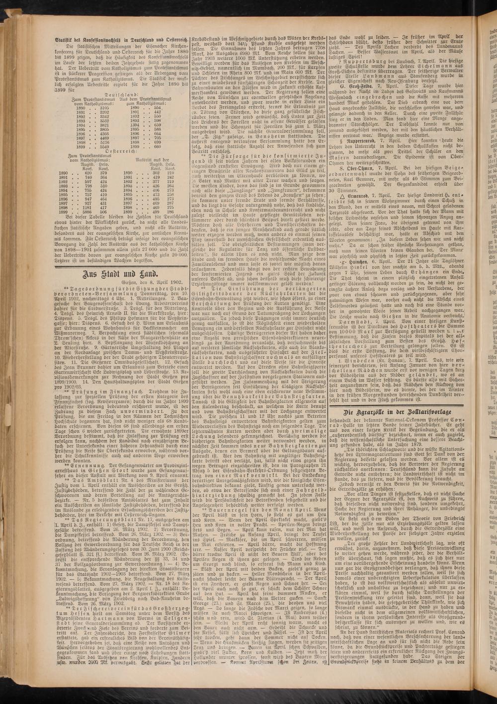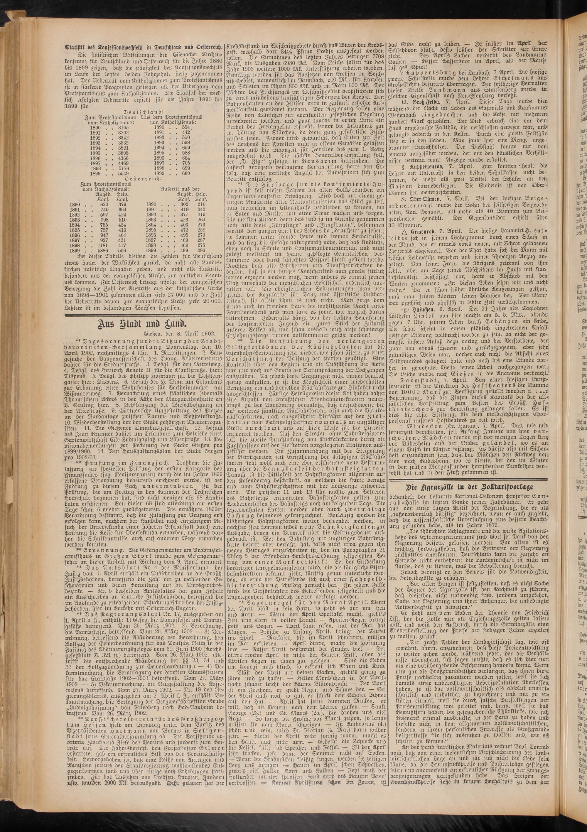 **TagesordnungfürdieSitzungderStadt- Verordneten-Versammlung Donnerstag, den 10. April 1902, nachmittags 4 Uhr. 1. Mitteilungen. 2. Bau- gesuche der Baugenossenschaft des Evang. Arbeitervereins dahier für die Crednerstraße. 3. Desgl. für den Mittelweg. 4. Desgl. des Heinrich Arnold II. für die Marktstraße, hier: Dispens. 5. Desgl. des Philipp Hofmann für die Wetzstein- gasse; hier: Dispens. 6. Gesuch des H. Winn um Erlaubnis zur Erbauung eines Wohnhauses für Backsteinmacher am Wißmarerweg. 7. Verpachtung eines städtischen (ehemals Throm'schen) Ackers in der Nähe der Margarethenhütte an L. Seuling hier. 8. Bepflanzung der Wieseckböschung an der Alicestraße. 9. Gärtnerische Umgestaltung des Platzes an der Nordanlage zwischen Tamm- und Wetzsteinstraße. 10. Wiederherstellung der der Stadt gehörigen Theaterrequi- fiten. 11. Die Gießener Omnibusgesellschast. 12. Gesuch des Jean Brunner dahier um Erlaubnis zum Betriebe einer Gartenwirtschaft Ecke Ludwigsplatz und Löberstraße. 13. Revisionsbemerkungen zur Rechnung der Stadt Gießen pro 1899/1900. 14. Den Haushaltungsplan der Stadt Gießen pro 1902/03.