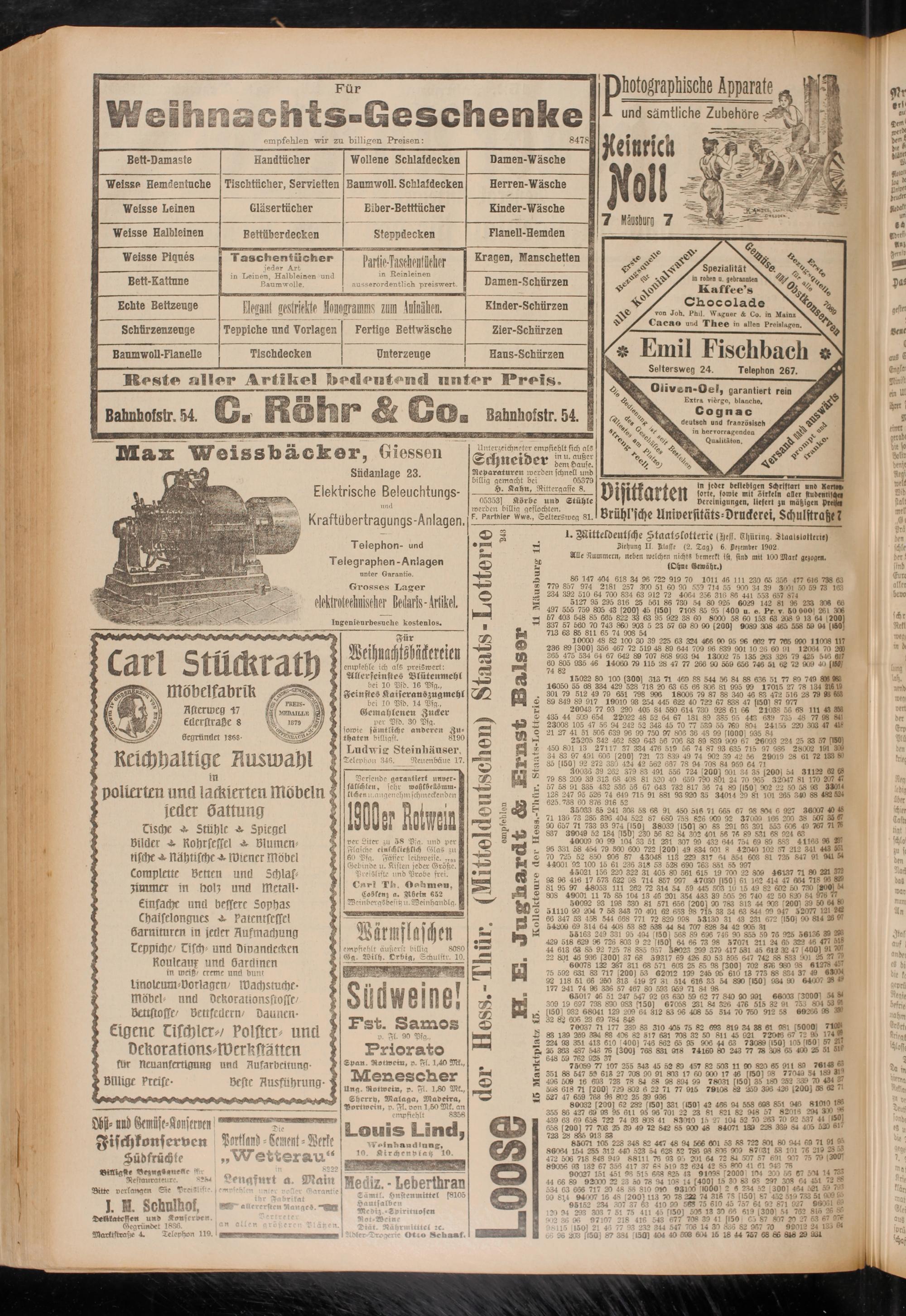 Ung. Rotwein, p. Fl. 1,80 Mk., Sherrh, Malaga, Madeira, Portwein, p. Fl. von 1,50 Mk. an empfiehlt 8358