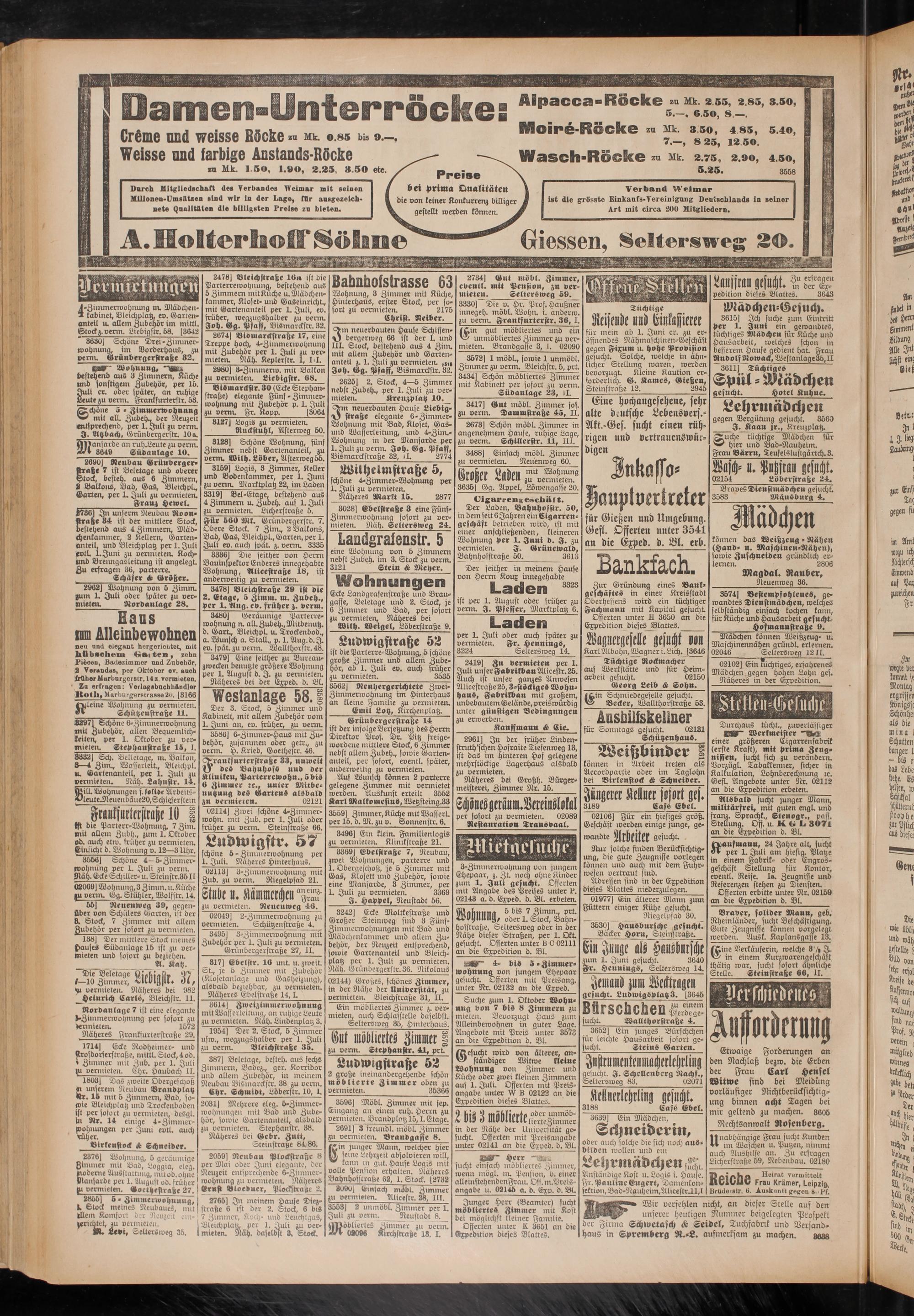 8159] Logis, 3 Zimmer, Keller und Bodenkammer, per L. Juni zu verm. Marktplatz 22, im Laden 3319] Bel-Etage, bestehend aus 4 Zimmern u. Zubeh. auf L Juli zu vermieten. Licherstraße 5. Kür 560 Mk. Grünbergerstr. 7. Obere Stock. 7 Zinu, 2 Balkons, Bad, Gas, Bleichpl., Garten, per 1. Juli ev. auch spät, z. penn. 3335