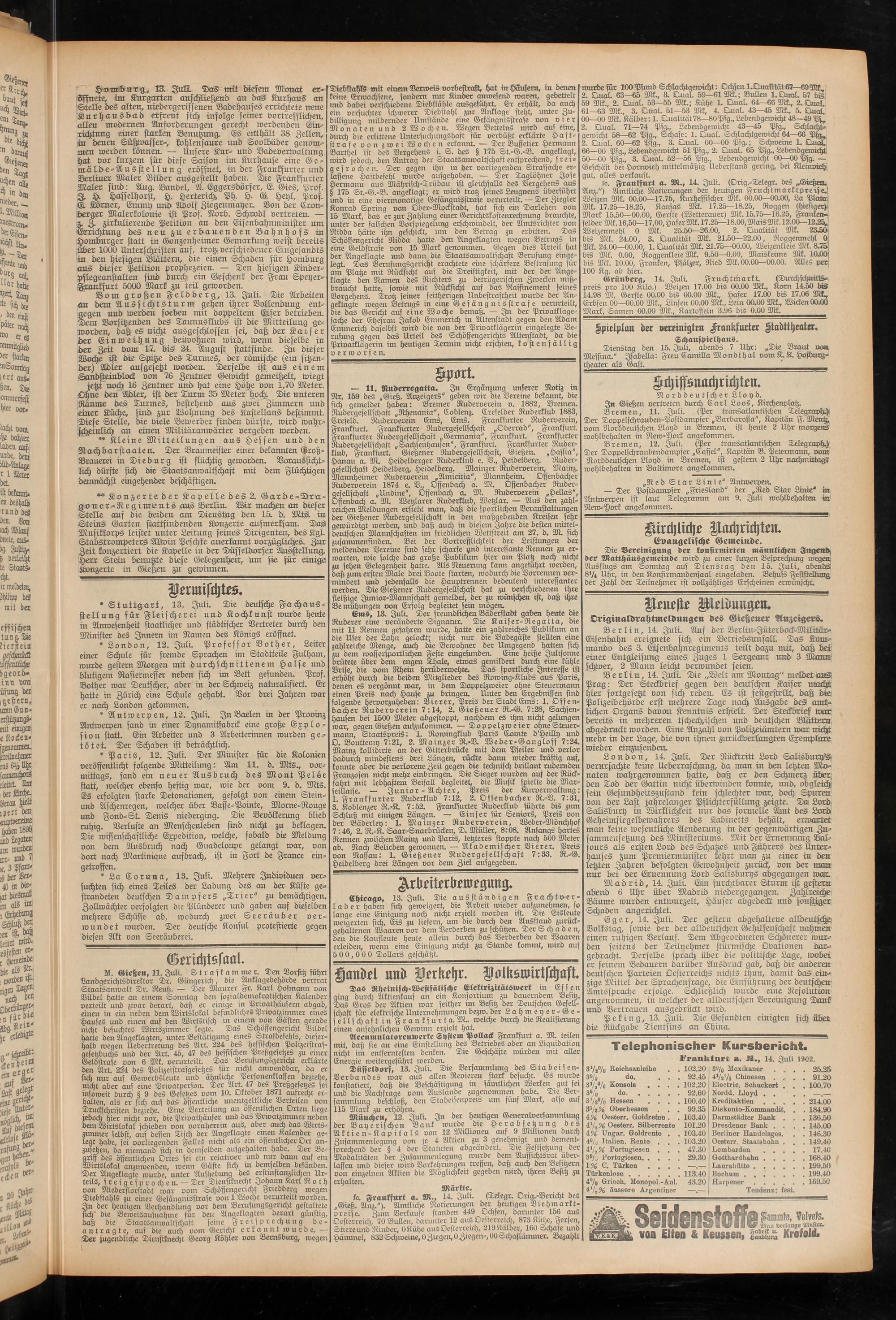Chicago, 13. Juli. Die ausständigen Frachtverlader haben sich geweigert, die Arbeit wieder aufzunehmen, so lange eine Einigung noch nicht erzielt worden ist. Die Eisleute weigerten sich, As zu liefern, um die durch den Ausstaud zurück- gehaltenen Maaren vor dem Verderben zu schützen. Der Schaden, den die Kaufleute heute allein durch das Verderben der Maaren erleiden, wenn eine Einigung nicht zu Stande kommt, wird auf 500,000 Dollars geschätzt.