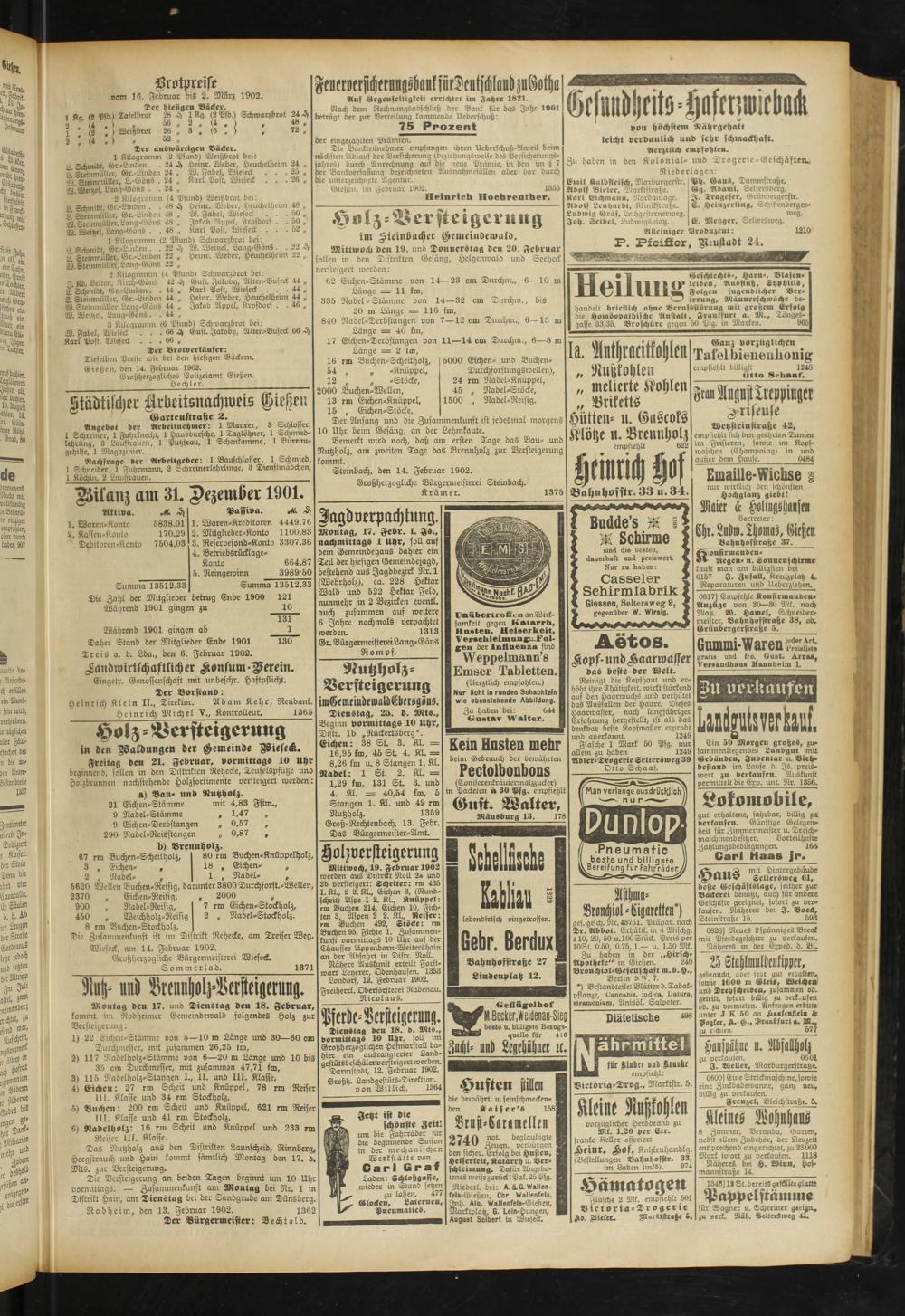 Mittwoch, 19. Februar 1902 werden aus Distrikt Noll 2a und 2b versteigert: Scheiter: rm 435 1. Kl., 2 2. EL, Eichen 3, (Rund* scheit) Aspe 1 2. KL, Knüppel: rm Buchen 214, Eichen 10, Fichten 3, Aspen 2 2. KL, Reiser: rm Buchen 492, Stöcke: rm Buchen 95, Fichte 1. Zusammenkunft vormittags 10 Uhr auf der Chaussee Appenborn-Weitershain an der Abfahrt in Distr. Noll.