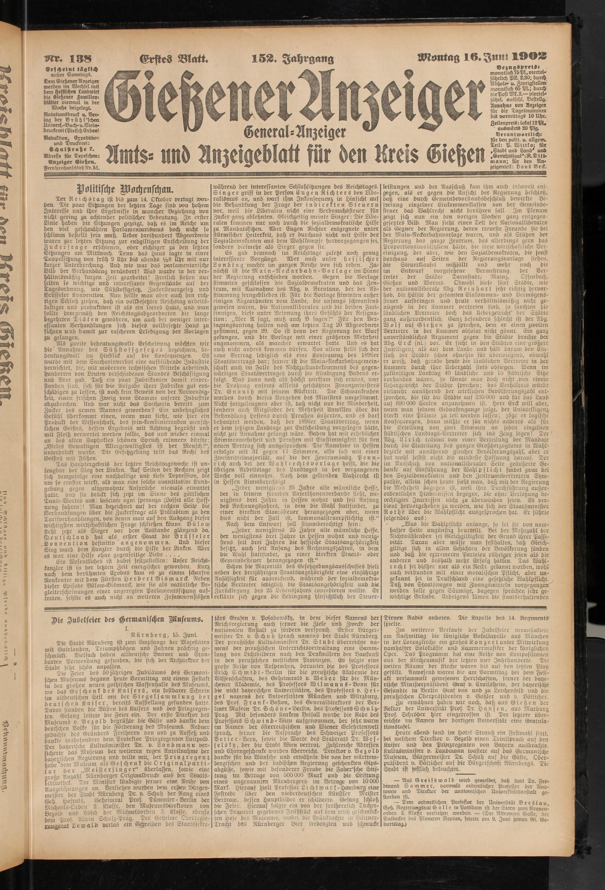 Heute abend fand im Hotel Strauß ein Festmahl statt, bei welchem Direktor v. Bezold einen Trinkspruch auf den Kaiser und den Prinzregenten von Bayern ausbrachte. Kultusminister v. Landmann toastete auf das Germanische Museum, Bürgermeister Dr. Schuh auf die Gäste, Ober- prchident v. Bötticher auf die Bürgerschaft Nürnbergs. Tie Stadt ist festlich beleuchtet.