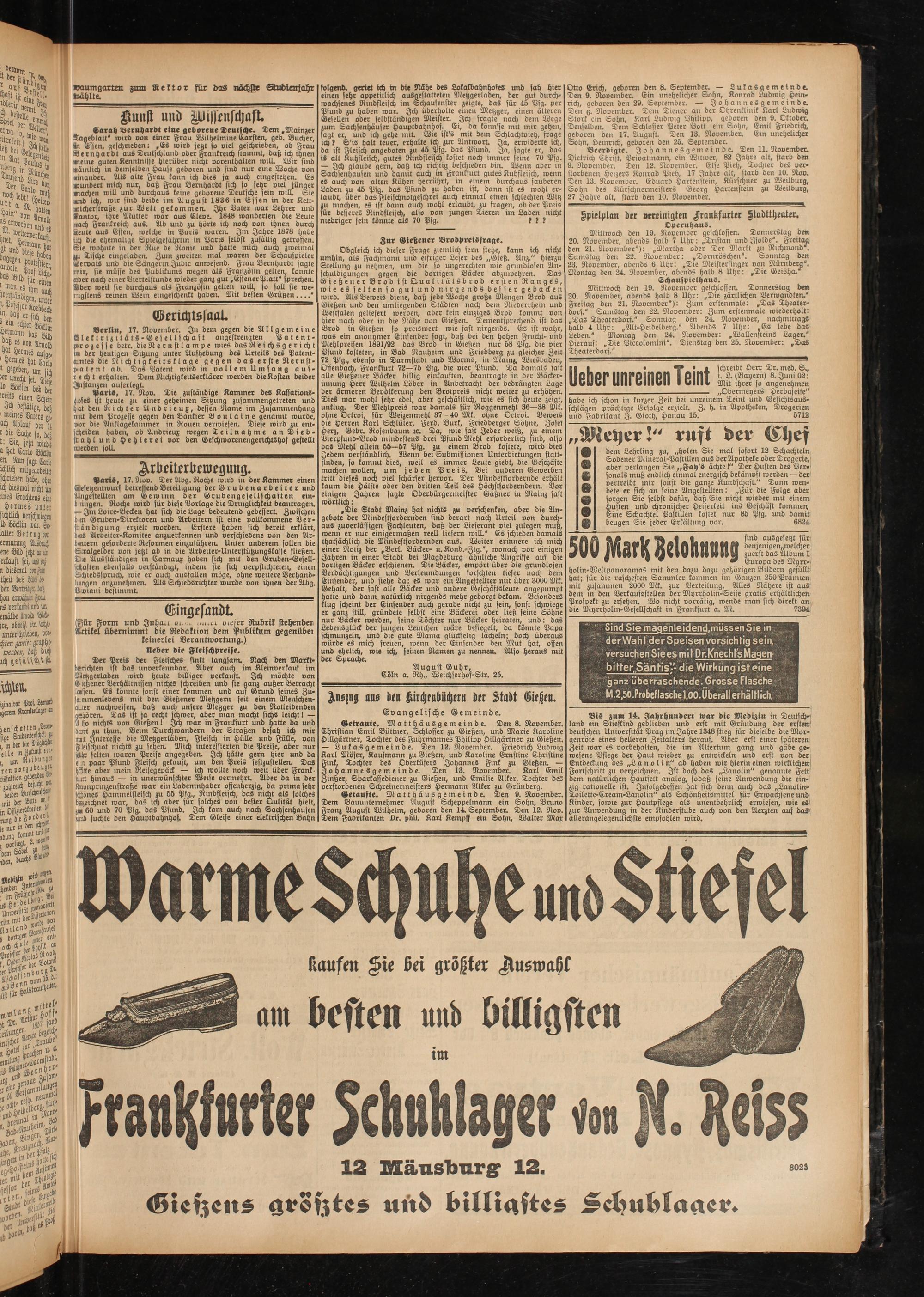 Der Preis ber Fleisches sinkt langsam. Nach ben Marktberichten ist bas unverkennbar. Aber auch im Kleinverkauf im Heßgerlaben wirb heute billiger verkauft. Ich möchte von K-ietzener Verhältnissen nichts schreiben unb sie ganz außer Betracht [affen. Es könnte sonst einer kommen unb auf Grunb feines Zu- |a inmenlebenS mit ben Gießener Metzgern fett einem Menschen- aLter nachweisew baß auch unsere Metzger zu ben Notleibenben gehören. Tas ist ja recht schwer, aber man macht sichs leicht l — 21 Iso nichts von Gießen 1 Ich war in Frankfurt unb hatte ba unb dort zu thun. Beim Durchwandern ber Straßen besah ich mir miit Interesse bie Metzgerläben, Fleisch in Hülle unb Fülle, von Flleischnot nichts zu sehen. Mich ütteressierten bie Preise, aber nur selhr selten loaren Preise angegeben. Ich hätte gern hier unb da ei n paar Pfund Fleisch gekauft, um ben Preis festzustellen. Das Hölle aber mein Reisegepäck — ich wollte noch weit über Frank- suill hinaus — in unerwünschter Weise vermehrt. Aber ba in ber ttnonprmzeiistraße war ein Uabeninhaber offenherzig, ba prima sehr stzönes Hammelfleisch zu 55 Pfg., Rinbflelsch, bas nicht als solches bejeichnet war, bas ich aber für solches von bester uulität hielt, 6» 60 unb 70 Pfg. bas Pfund. Ich kam auch nach Sachsenhausen unb suchte ben Hauptbahnhof. Dem Gleise einer elektrischen Bahn