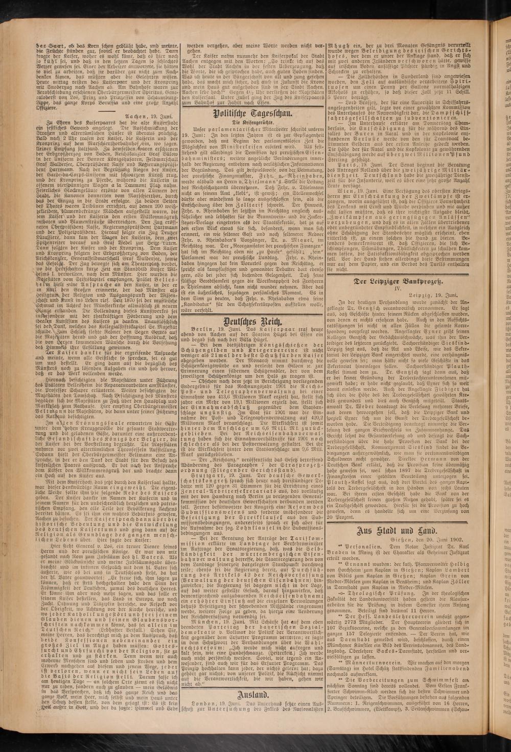 Berlin, 19. Juni. Das Kaiserpaar traf heute abend von Aachen auf der Station Hügel bei Essen ein und begab sich nach der Billa Hügel.