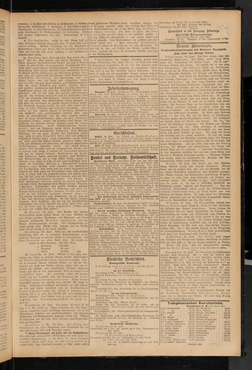 Düsseldorf, 20. Juni. Der Kaiser sagte wegen) des Ablebens des Königs von Sachsen den Besuch in Düffel-", dorf ab, doch hoffe er, ihn im August nachholen zu können^ Wien, 20. Juni. Wie die Morgenblätter melden,, wird der Kaiser Franz Josef nach Dresden reisen.