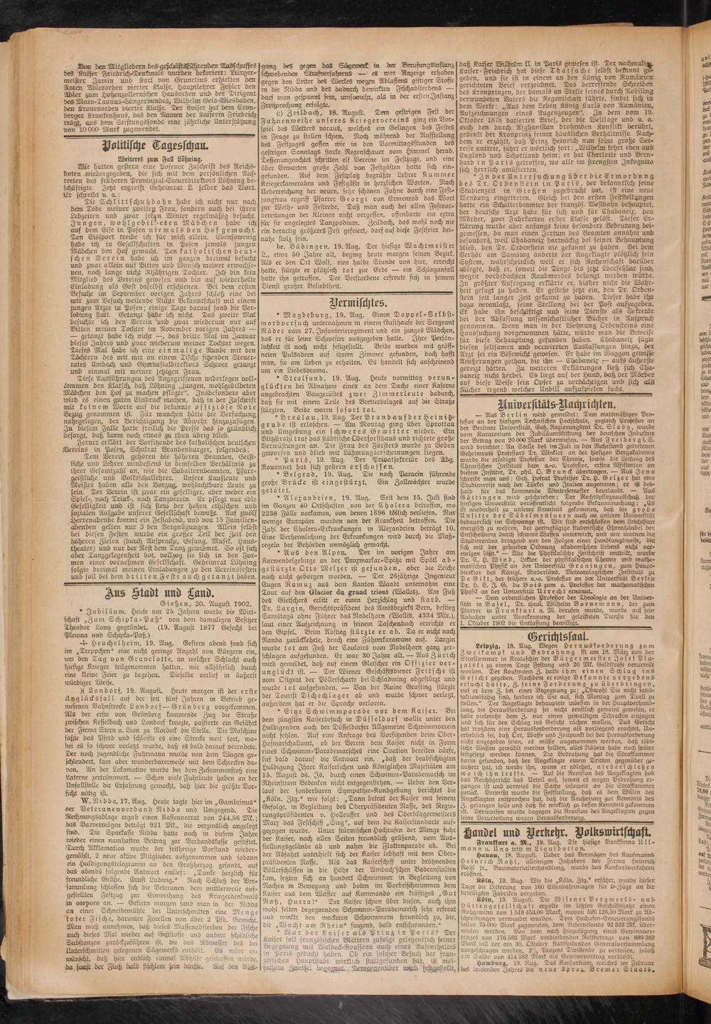 * Breslau, 19. Aug. Der BrandaufderHeinitz- grübe ist erloschen. — Am Montag ging über Sprottau und Umgebung ein schweres Gewitter nieder. Ein Blitzstrahl traf das städtische Oberforsthaus und richtete große Verwüstungen an. Die Frau des Försters wurde zu Boden geworfen und blieb mit Lähmungsersch-einungen liegen.