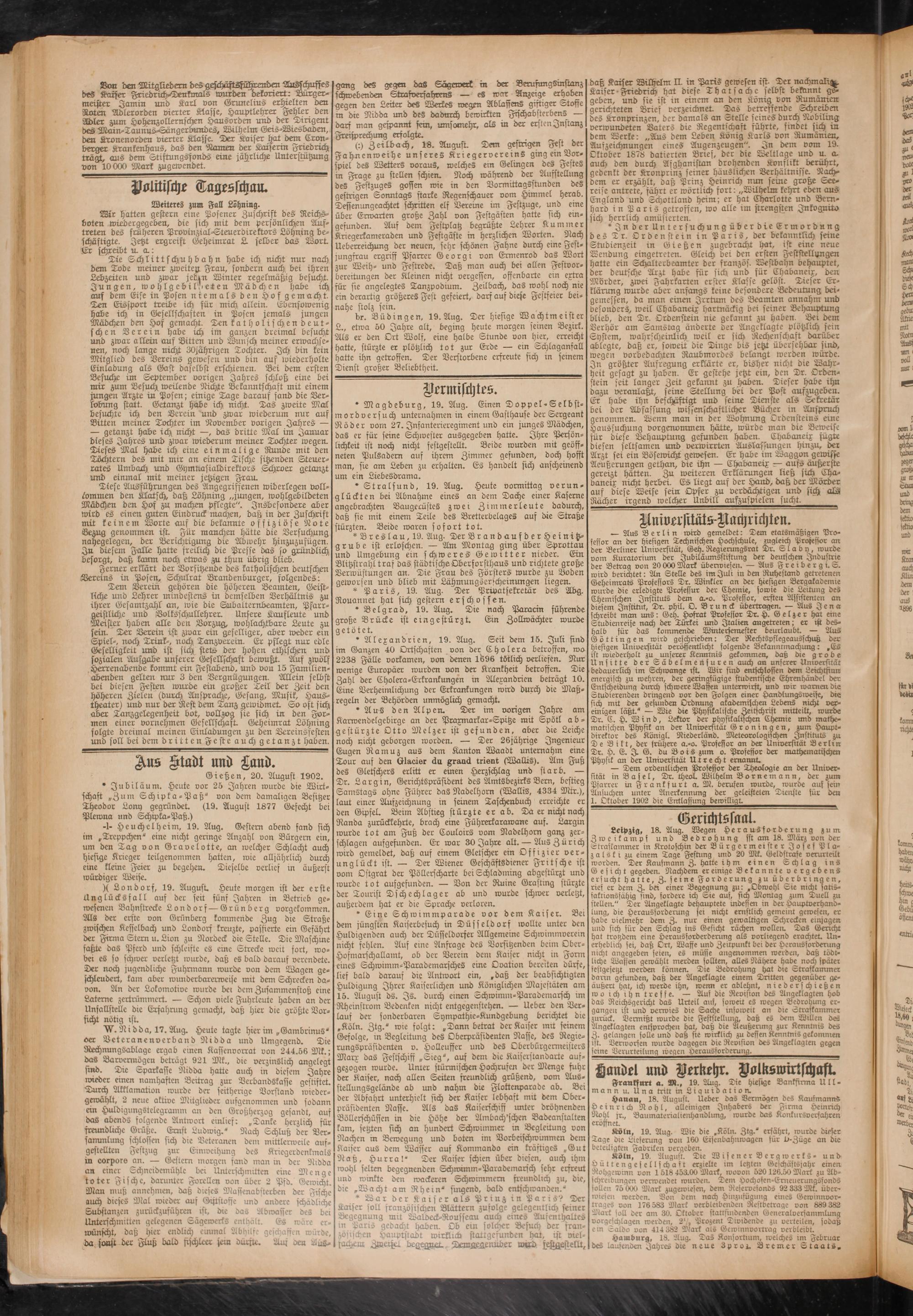 • Alexandrien, 19. Aug. Seit dem 15. Juli sind im Ganzen 40 Ortschaften von der Cholera betroffen, roo 2238 Fälle vorkamen, von denen 1&96 tätlich verliefen. Nur wenige Europäer wurden von der Krankheit betroffen. Die Zahl der Cholera-Erkrankungen in Alexandrien beträgt 10. Eine Verheimlichung der Erkrankungen wird durch die Maßregeln der Behörden unmöglich gemacht.