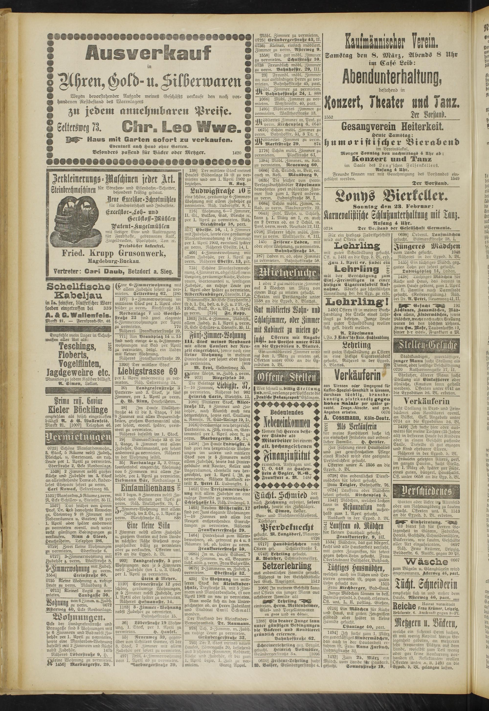 138] Der mittlere Stock meines Hauses Südanlage 15 ist zu vermieten und am 1. April 1902 zu beziehen._____________A. Katz.