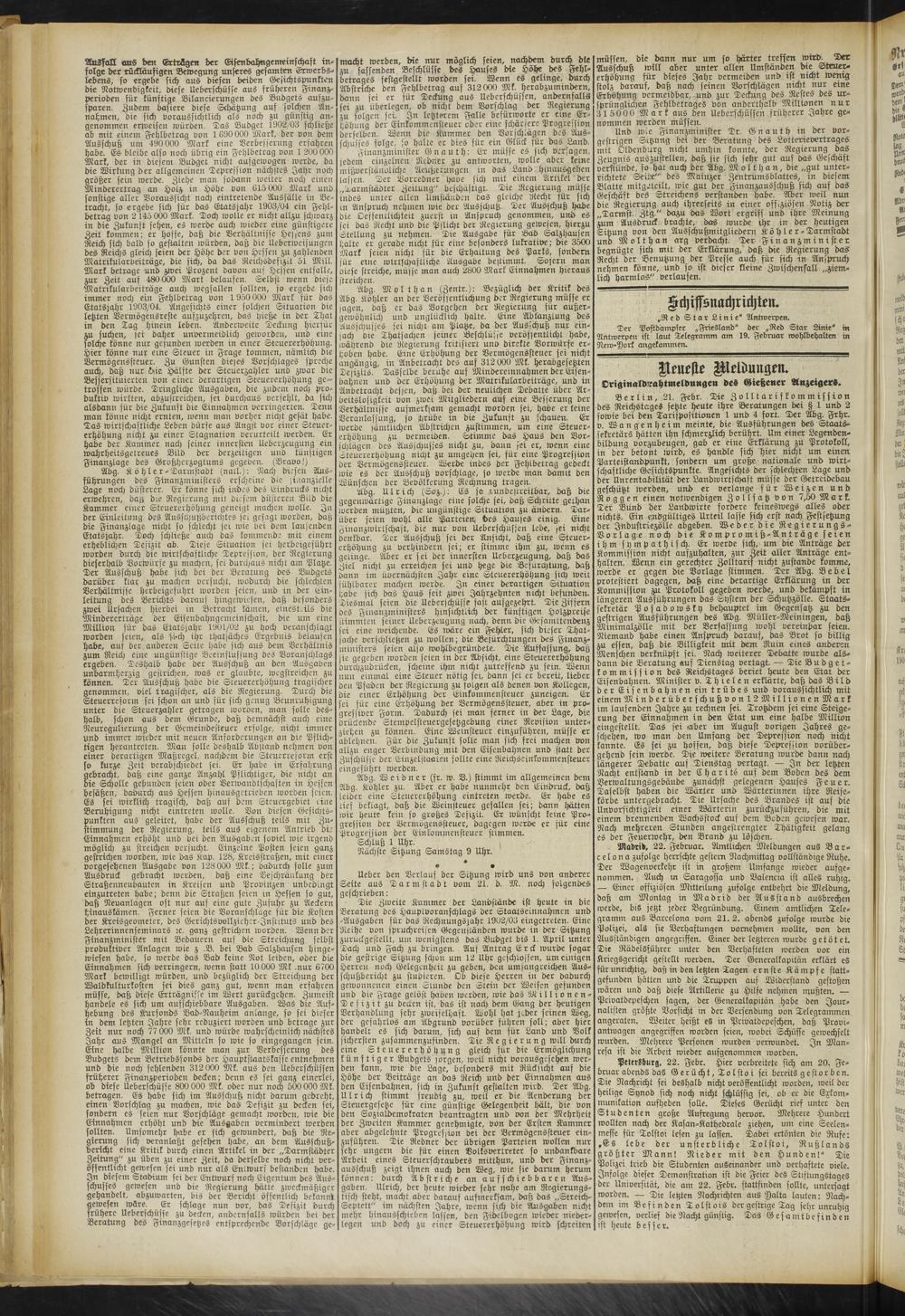 Berlin, 21. Febr. Die Zolltarifkommifsion des Reichstages setzte heute ihre Beratungen bei § 1 und 2 sowie bei den Tarifpositionen 1 und 4 fort. Der Abg. Frhr. v. Wangenheim meinte, die Ausführungen des Staatssekretärs hätten ihn schmerzlich berührt. Um einer Legendenbildung vorzubeugen, gab er eine Erklärung zu Protokoll, in der betont wird, es handle sich hier nicht um einen Parteistandpunkt, sondern um große nationale und wirtschaftliche Gesichtspunkte. Angesichts der schlechten Lage und ber Unrentabilität der Landwirtschaft müsse der Getreidebau geschützt werden, und er verlange für Weizen und Roggen einen notwendigen Zollsatz von 7,50 Mark. Ter Bund der Landwirte fordere keineswegs alles oder nichts. Ein endgültiges Urteil lasse sich erst Nach Festsetzung der Jndustriezölle abgeben. Weder die Regierungs- Vorlage noch die Kompromiß-Anträge seien ihm sympathisch. Er werde sich, um die Anträge der Kommission nicht aufzuhalten, zur Zeit aller Anträge enthalten. Wenn ein gerechter Zolltarif nicht zustande komme, werde er gegen die Vorlage stimmen. Ter Abg. Bebel protestiert dagegen, daß eine derartige Erklärung in der Kommission zu Protokoll gegeben werde, und bekämpft in längeren Ausführungen das System der Schutzzölle. Staatssekretär Posadowsky behauptet im Gegensatz zu den gestrigen Ausführungen des Abg. Müller-Meiningen, daß Minimalzölle mit der Verfassung wohl vereinbar seien. Niemand habe einen Anspruch darauf, das Brot so billig zu essen, daß die Billigkeit mit dem Ruin eines anderen Menschen verknüpft sei. Nach weiterer Debatte wurde alsdann die Beratung auf Dienstag vertagt. — Die Budgetkommission des Reichstages beriet heute den Etat der Eisenbahnen. Minister v. Thielen erklärte, daß das Bild der Eisenbahnen ein trübes und voraussichtlich mit einem Minderüberschußvonl2MillionenMark im laufenden Jahre zu rechnen sei. Trotzdem sei eine Steigerung der Einnahmen in den Etat um eine halbe Million eingestellt. Das sei aber im August vorigen Jahres geschehen, wo man den Umfang der Depression noch nicht kannte. Es sei zu hoffen, daß diese Depression vorübergehend sein werde. Die weitere Beratung wurde dann nach längerer Debatte auf Dienstag vertagt. — In der letzten Nacht entstand in der Charite auf dem Boden des dem Verwaltungsgebäude zunächst gelegenen Hauses Feuer. Daselbst haben die Marter und Wärterinnen ihre Reisekörbe untergebracht. Tie Ursache des Brandes ist auf die Unvorsichtigkeit einer Wärterin zurückzuführen, die mit einem brennenden Wachsstock auf dem Boden gewesen war. Nach mehreren Stunden angestrengter Thätigkeit gelang es der Feuerwehr, den Brand zu löschen.