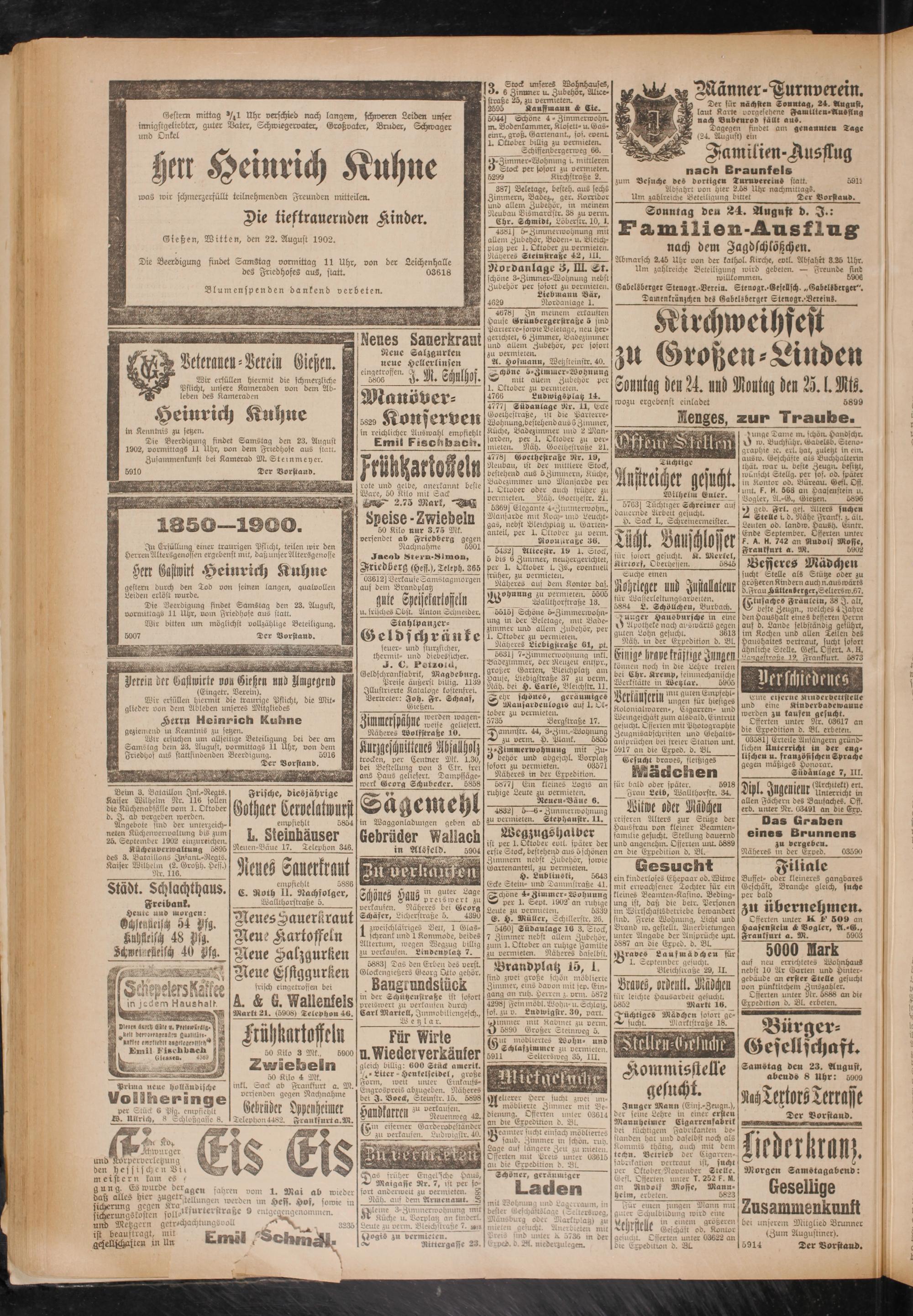 Die Beerdigung findet Samstag den 23. August 1902, vormittags 11 Uhr, von dem Friedhöfe aus statt.