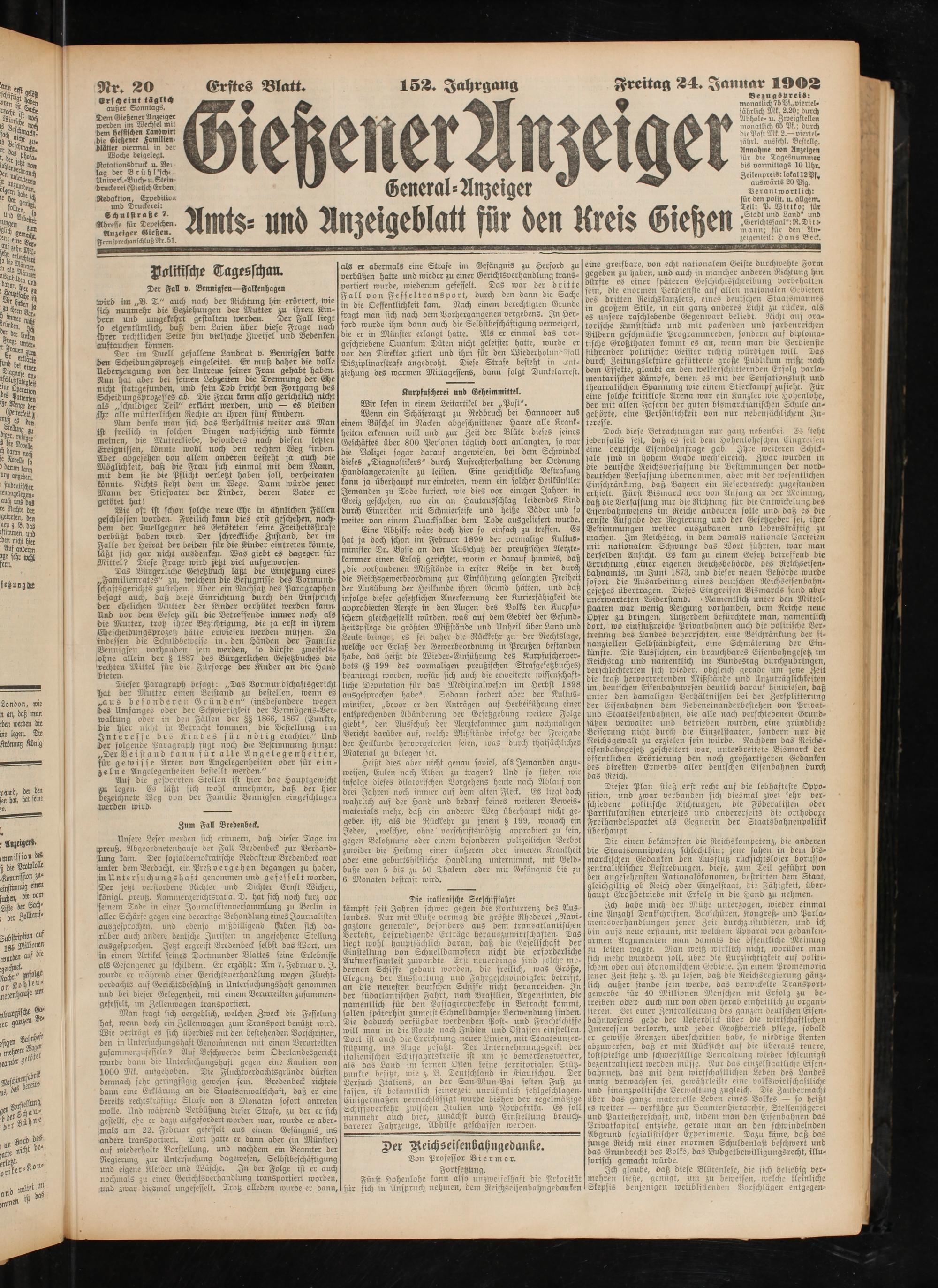 Adresse für Depeschen. Anzeiger Gießen.