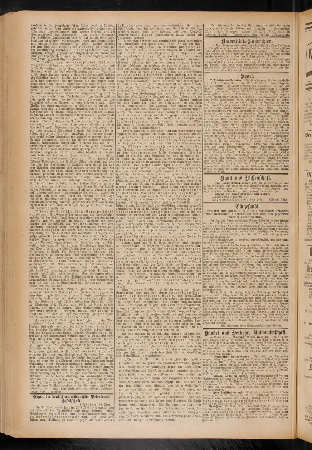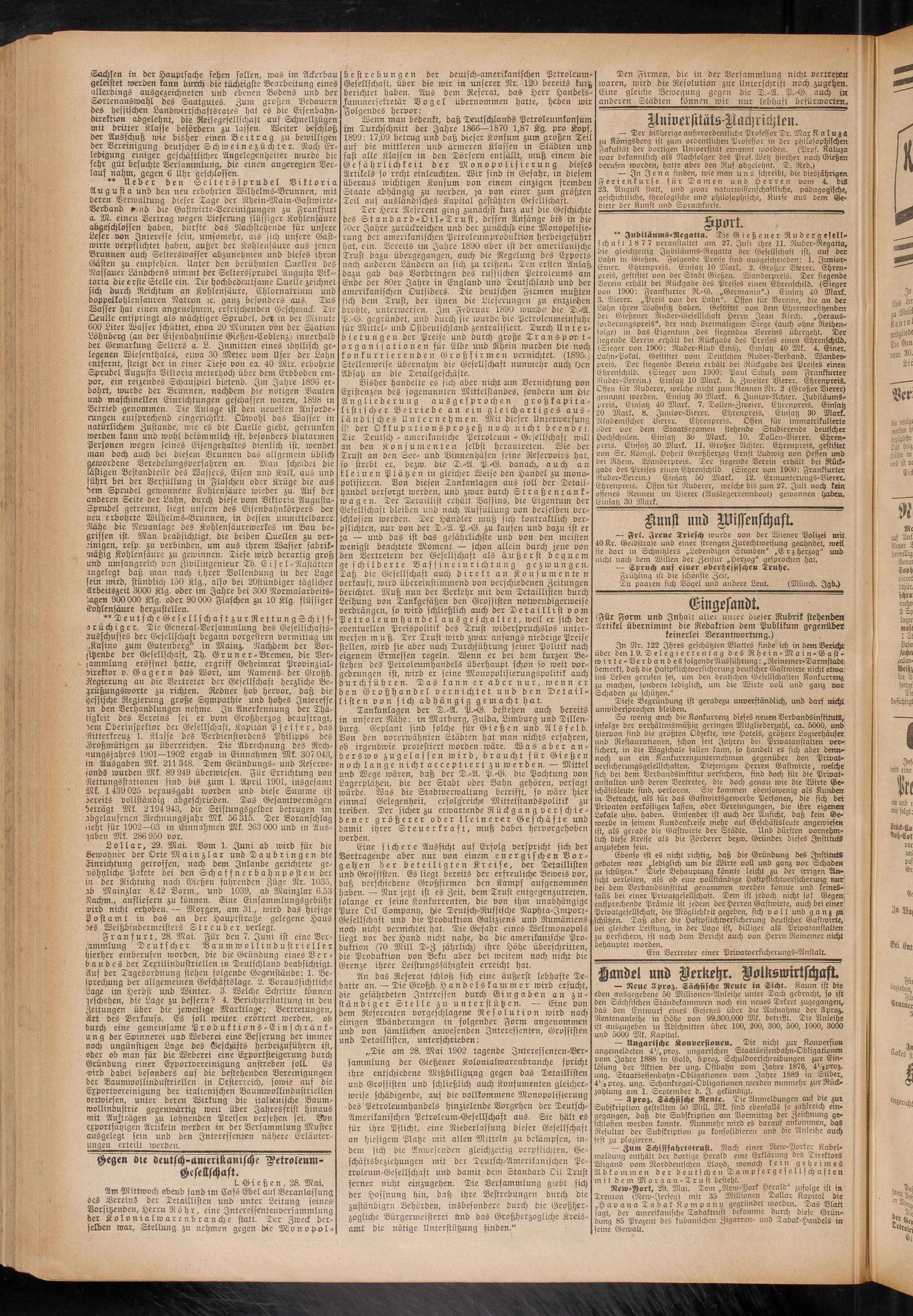 „Die am 28. Mai 1902 tagende Jnteressenten-Ver- sammlung der Gießener Kolonialwarenbranche spricht ihre entschiedene Mißbilligung gegen das Tetaillisten und Grossisten und schließlich auch Konsumenten gleicherweise schädigende, auf die vollkommene Monopolisierung des'Petroleumhandels hinzielende Vorgehen der Deutsch- Amerikanischen Petroleum-Gesellschaft aus. Sie hält es für ihre Pflicht, eine Niederlassung dieser Gesellschaft an hiesigem Platze mit allen Mitteln zu bekämpfen, indem sich die Anwesenden gleichzeitig verpflichten, Geschäftsbeziehungen mit der Deutsch-Amerikanischen Petroleum-Gesellschaft und damit dem Standard Oil Trust ferner nicht einzugehen. Die Versammlung giebt sich der Hoffnung hin, daß ihre Bestrebungen durch die zuständigen Behörden, insbesondere durch die Großherzogliche Bürgermeisterei Und das Großherzogliche Kreisamt die nötige Unterstützung finden."