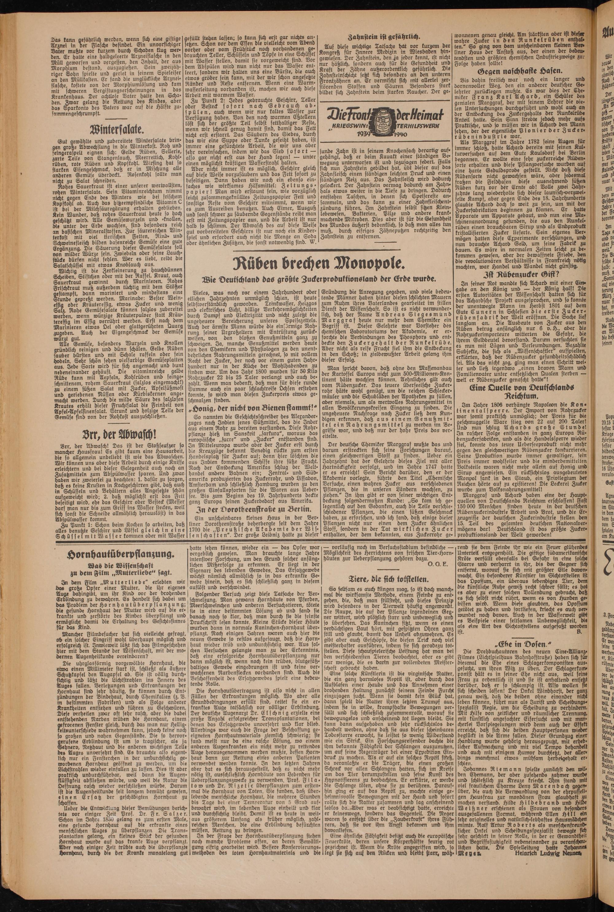 Im Jahre 1806 verhängte Napoleon die Kontinentalsperre. Der Import von Rohrzucker war somit praktisch unmöglich; der Preis für die geschmuggelte Ware stieg von 22 auf 200 Taler! Und nun schlug Achards große Stunde! In rascher Folge entstanden in ganz Europa Rübenzuckerfabriken, und als die Handelssperre wieder fiel, konnte das teure Ueberfeeprobuft nicht mehr gegen den gleichwertigen Rübenzucker konkurrieren. Seine Produktion wurde immer gewaltiger, sein Preis immer wohlfeiler und bie minderbemittelten Volksteile waren nicht mehr allein auf Honig und Sirup angewiesen. Ein rücksichtslos ausgebeutetes Monpol sank in den Staub, ein Privilegium der Reichen hörte auf zu existieren! Die Leckerei Zucker wurde zum Volksnahrungsmittel!