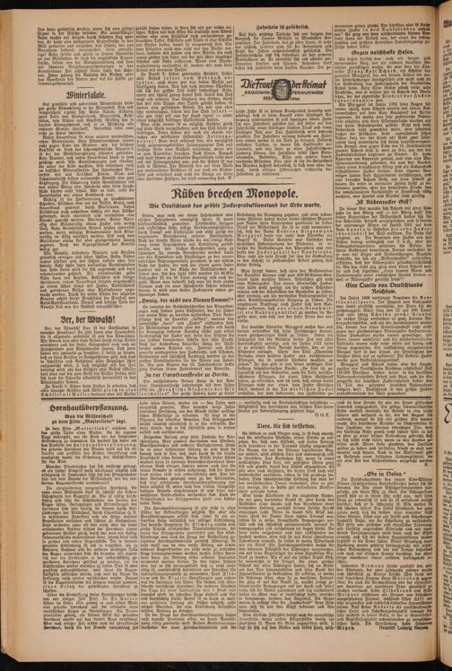 In seiner Not wandte sich Achard mit einer Eingabe an den König und — der König half! Die ersten Autoritäten der Wissenschaft hatten sich für das Achardsche Projekt ausgesprochen, und so konnte der unentwegte Mann im Herbst 1801 auf dem Gute (tune rn in Schlesien die er ft e Zuckerrübenfabrik der Welt eröffnen. Die Sache lief langsam an. Die Ausbeute von Zucker aus den Rüben betrug anfänglich nur 6 v. H., aber die Rohrzuckerimporteure witterten die Gefahr, die chrem Geldbeutel bevorstand. Darum versuchten sie es nun mit Lügen und Verleumdungen. Bezahlte Subjekte, die sich als „Wissenschaftte?' aufspielten, erklärten, daß der Rübenzucker gesundheitsschädlich fei. Als das nicht zog, ging man einen Schritt weiter und ließ irgendwo „einen braven Mann und Familienvater unter entsetzlichen Qualen sterben — weil er Rübenzucker genascht hatte"!