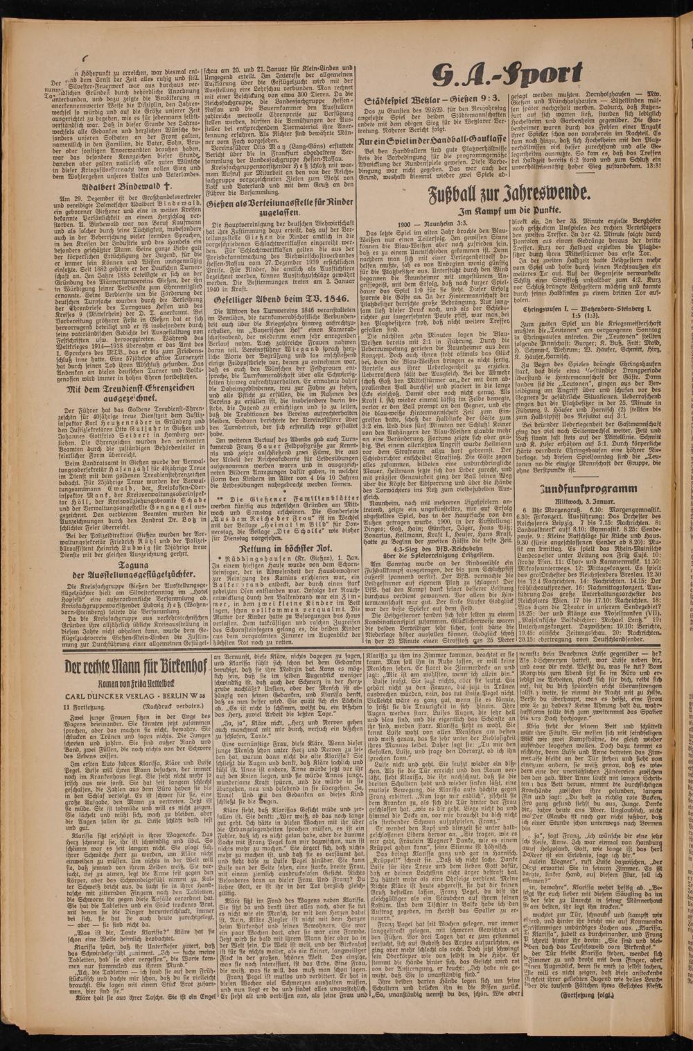 • Rüddingshausen (Kr. Gießen), 1. Jan. In einem hiesigen Hause wurde von dem Schornsteinfeger, der in Abwesenheit der Hausbewohner zur Reinigung des Kamins erschienen war, ein Balken ) rand entdeckt, der durch einen stark geheizten Ofen entstanden war. Infolge der Rauchentwicklung durch den Balkenbrand war ein Zimmer, in dem zwei kleine Kinder im Bett lagen, schon vollkommen verqualmt. Die Mutter der Kinder hatte zu Besorgungen das Haus verlassen. Dem tatkräftigen und raschen Zugreifen des Schornsteinfegers gelang es, die beiden Kinder aus dem verqualmten Zimmer im Augenblick der höchsten Not noch zu retten.