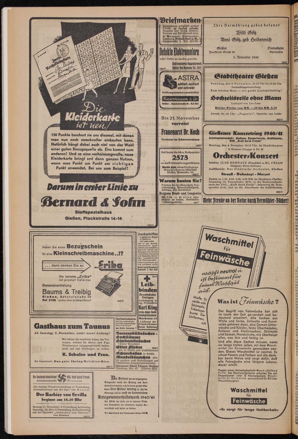 Karten zu 1.55, 2.05, 2.80, 3.55 RM. im Musikhaus ChaUier, Neuenweg 10, Fernsprecher 2671, in der Kartenverkaufsstelle der NSG., „Kraft durch Freude“, Seltersweg 60, Fernsprecher 2141, und an der Abendkasse des Stadttheaters.