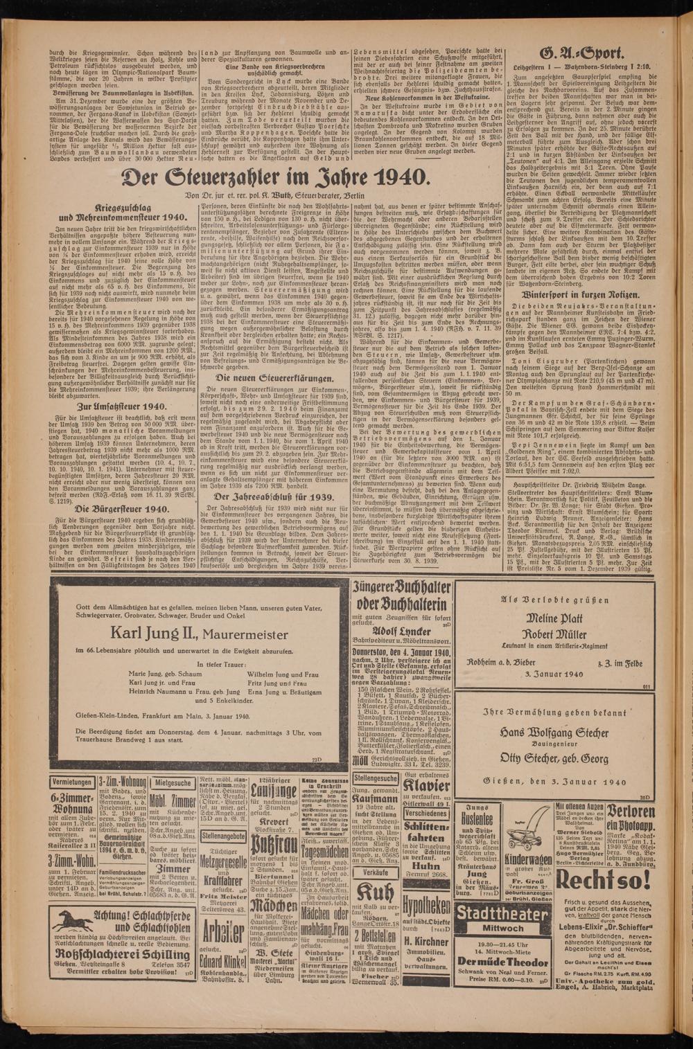 Hauptschriftleiter Dr. Friedrich Wilhelm Lange. Stellvertreter des Hauptschriftleiters: Ernst Blumschein. Verantwortlich für Politik, Feuilleton und die Bilder: vr. Fr. W. Lange; für Stadt Gießen. Provinz und Wirtschaft: Ernst Blumschein; für Sport: Heinrich Ludwig Neuner. Anzeigenleiter: Hans Beck. Verantwortlich für den Inhalt der Anzeigen: Theodor Kümmel. Druck und Verlag: Brühlsche Universitätsdruckerei, R. Lange, K.-G., sämtlich in Gießen. Monatsbezugspreis 2,05 RM. einschließlich 25 Pf. Zustellgebühr, mit der Illustrierten 15 Pf. mehr. Einzelverkaufspreis 10 Pf. und Samstags 15 Pf., mit der Illustrierten 5 Pf. mehr. Zur Zeit ist Preisliste Nr. 5 vom 1. Dezember 1939 gültig.