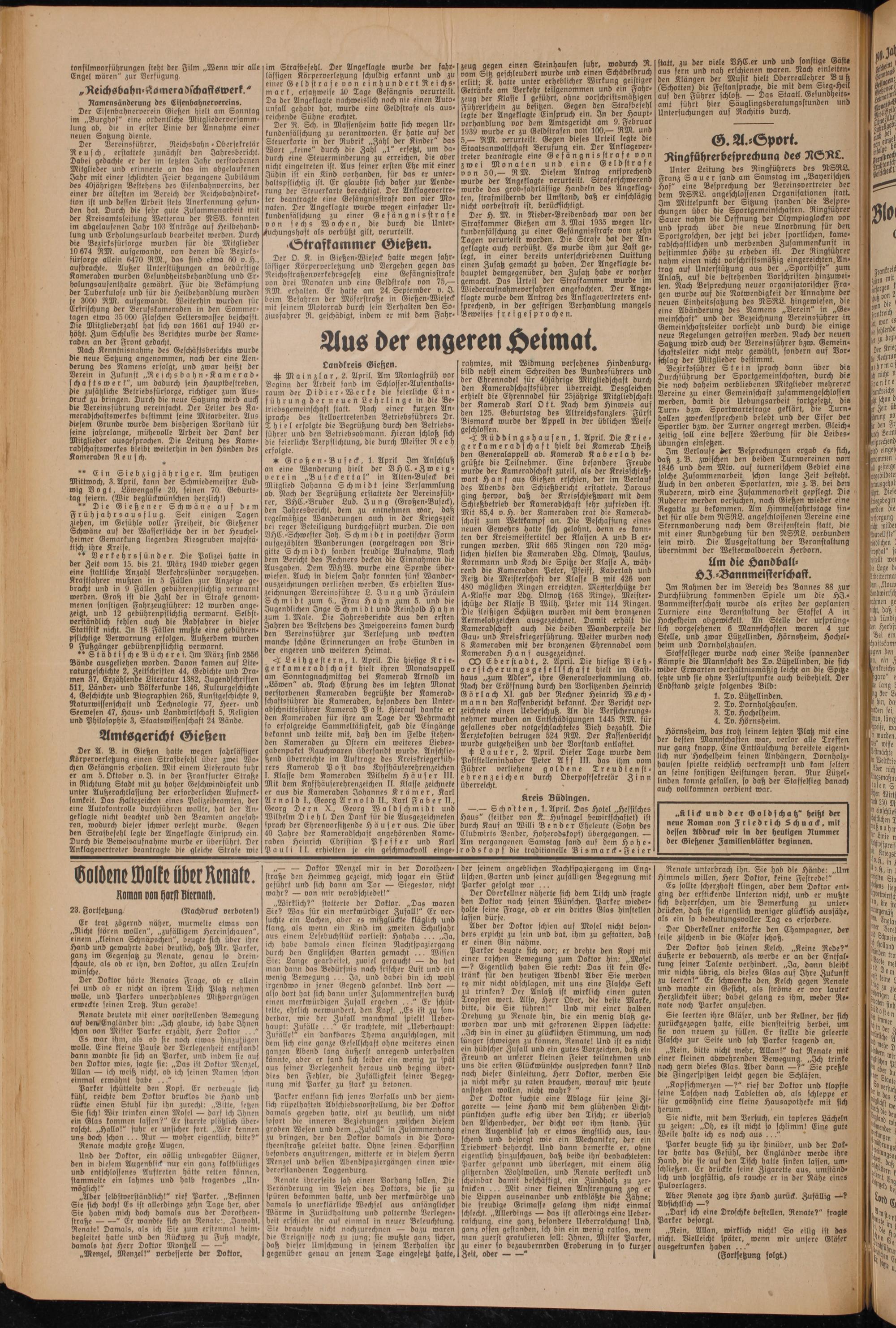 statt, zu der viele DHC.er und und sonstige Gaste aus fern und nah erschienen waren. Nach einleiten- den Klängen der Musik hielt Oberreallehrer Buß (Schotten) die Festansprache, die mit dem Sieg-Heil auf den Führer schloß. — Das Staatl. Gesundheits- amt führt hier Säuglingsberatungsstunden und Untersuchungen auf Rachitis durch.