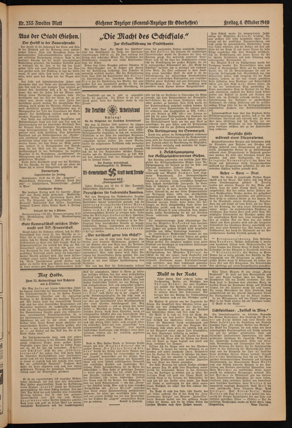 Mit Verdis Oper „Die Macht des Schicksals" leitet das Stadttheater die Reche der Opernneuinszenierungen 1940/41 ein. Die Oper verlangt den Einsatz aller technischen Mittel. Die Drehbühne des Stadttheaters ermöglicht eine rasche Aufeinanderfolge der Bilder.