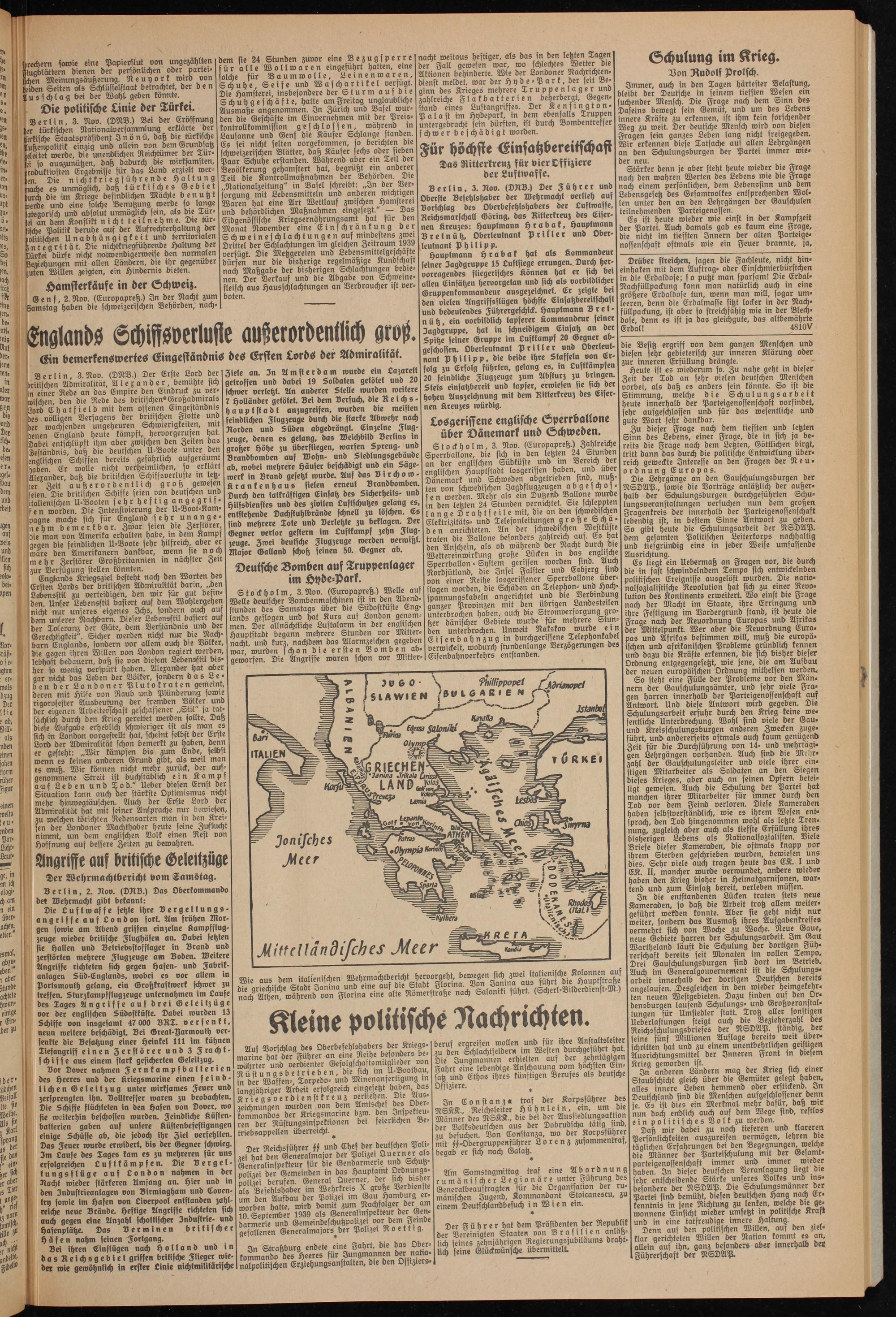 Vor Dover nahmen Fernkampfbatterien bes Heeres unb bet Kriegsmarine einen feinblichen Geleilzug unter wirksames Feuer unb zersprengten ihn. Volltreffer waren zu beobachten. Die Schiffe flüchteten in ben Hafen von Dover, wo sie weiterhin befchosfen würben. Feinbliche Küstenbatterien gaben auf unsere Küstenbefestigungen einige Schüsse ab, bie jeboch ihr Ziel verfehlten. Das Feuer würbe erroibert, bis bet Gegner fchwieg. Im Laufe bes Tages kam es zu mehreren für uns erfolgreichen Luftkämpfen. Die Vergeltungsflüge auf London nahmen in der Nacht wieder stärkeren Umfang an. hier und in ben Jnbuftrieanlagen von Birmingham unb Coventry fowie im Hafen von Liverpool entstauben zahlreiche neue Brände. heftige Angriffe richteten fich auch gegen eine Anzahl schottischer Jnbustrie- unb hafenplähe. Das Verminen britischer Häfen nahm feinen Fortgang.