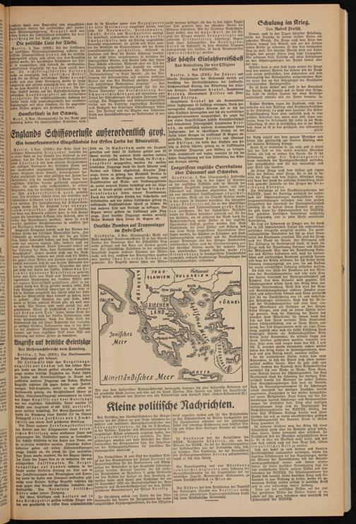 Ziele an. In Amsterdam wurde ein Lazarett getroffen und dabei 19 Soldaten getötet und 20 schwer verletzt. An anderer Stelle wurden weitere 7 Holländer getötet. Bei dem Versuch, die Reichs- Hauptstadt anzugreifen, wurden die meisten feindlichen Flugzeuge durch die starke Abwehr nach Korben und Süden abgedrängt. Einzelne Flugzeuge, denen es gelang, das Weichbild Berlins in groher höhe zu überfliegen, warfen Spreng- und Brandbomben auf Wohn- und Siedlungsgebäude ab, wobei mehrere häufer befchädigt und ein Sägewerk in Brand gefetzt wurde. Auf das Virchow- krankenhaus fielen erneut Brandbomben. Durch den tatkräftigen Einsatz des Sicherheits- und Hilfsdienstes und des zivilen Luftschutzes gelang es, entstehende Dachstuhlbrände schnell zu löschen. Ls sind mehrere Tote und Verletzte zu beklagen. Der Gegner verlor gestern im Luftkampf zehn Flugzeuge. Zwei deutsche Flugzeuge werden vermißt. Major Galland schoß seinen 50. Gegner ab.