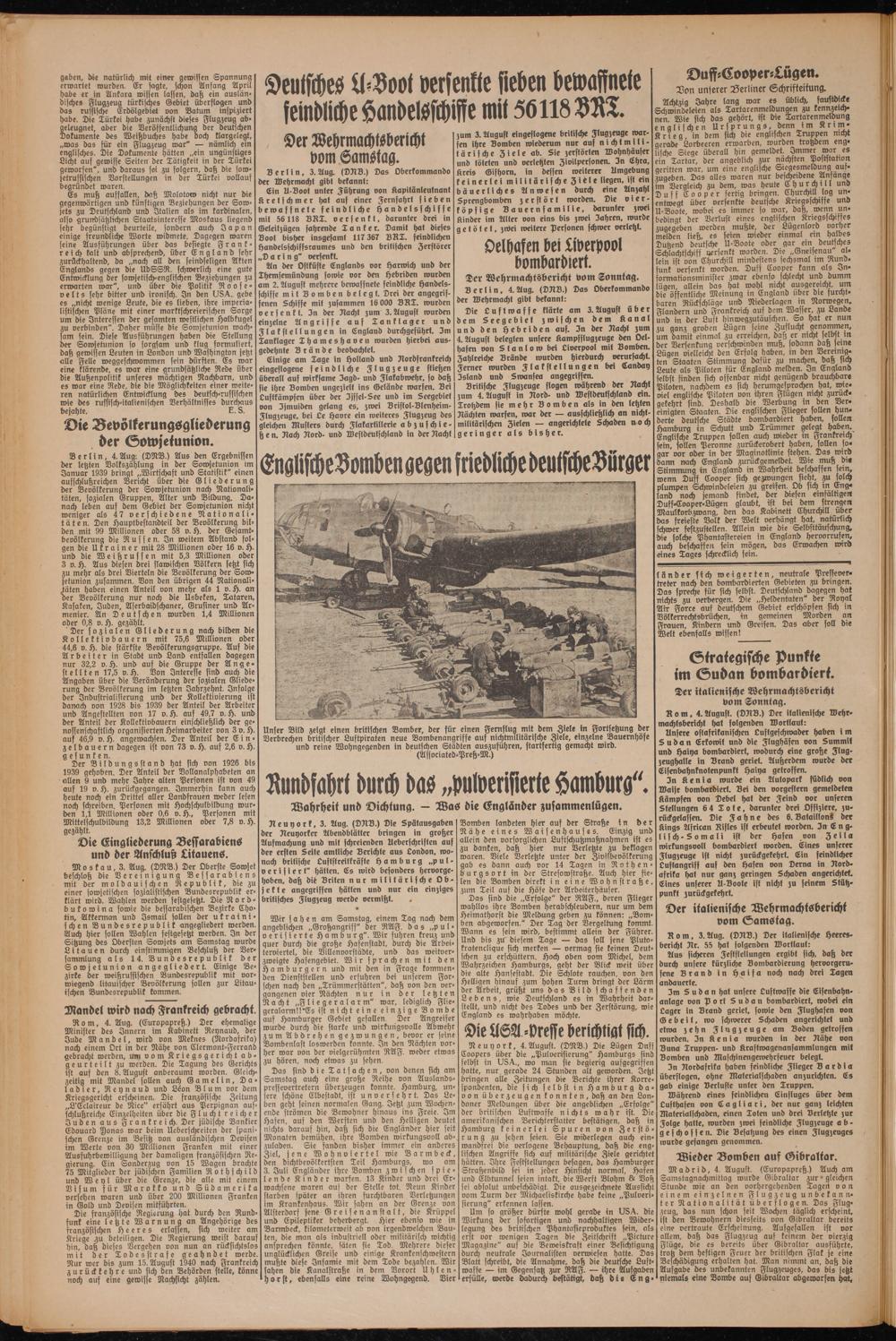 zum 3. August eingeflogene britische Flugzeuge warfen ihre Bomben wiederum nur auf nichtmili - tärische Ziele ab. Sie zerstörten Wohnhäuser und töteten und verletzten Zivilpersonen. 3n Ehra, kreis Gifhorn, in dessen weiterer Umgebung keinerleimilitärifcheZiele liegen, ist ein bäuerliches Anwesen durch eine Anzahl Sprengbomben zerstört worden. Die vierköpfige Bauernfamilie, darunter zwei Kinder im Alter von eins bis zwei 3ahren, wurde getötet, zwei weitere Personen schwer verletzt.